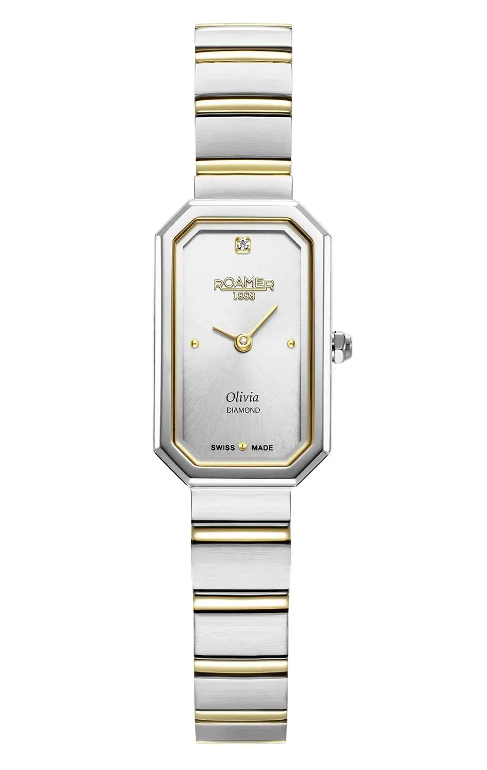 Dámské hodinky s diamantem Roamer Olivia Diamond 627845 47 19 20 jsou bicolor variantou pro ženy, které oceňují přesnost formy a uvědomělou eleganci uzavřenou v jemných proporcích. Obdélníkové pouzdro o rozměrech 18 mm × 29 mm, geometrické linie a minimalistický číselník Roamer s diamantem vytvářejí kompozici, která nepotřebuje doplňky, aby přitahovala pohledy – stačí jemný záblesk světla, aby vynikla její plná osobitost.