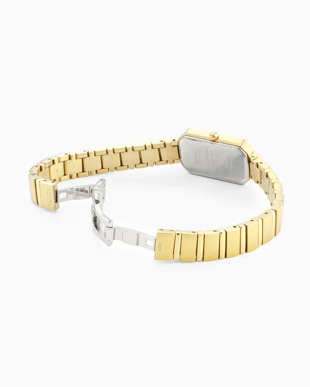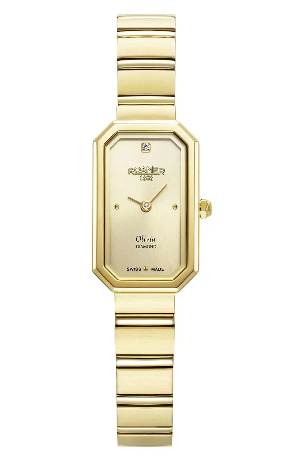 Dámské hodinky s diamantem Roamer Olivia Diamond 627845 48 39 20 jsou zlatou verzí určenou ženám, které oceňují precizní formu a uvědomělou eleganci uzavřenou v jemných proporcích. Obdélníkové pouzdro o rozměrech 18 mm x 29 mm, geometrické linie a minimalistický ciferník Roamer s diamantem vytvářejí kompozici, která nepotřebuje žádné doplňky, aby přitahovala pohledy – stačí jemný odlesk světla, aby vynikl její plný charakter.