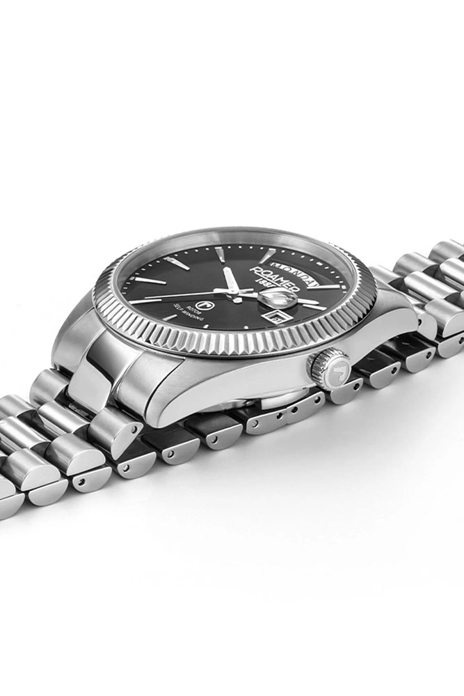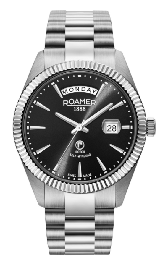 Barvy prezentované časomíry jsou uzavřeny ve dvou odstínech – černé s nádechem sunburst a sametově lesklé oceli. Stříbrná ocel, byla prezentována ve dvou variantách: lesklá, leštěná a sametová, kartáčovaná, díky čemuž jsou hodinky velmi atraktivní a živé. Pouzdro je vyrobeno z nerezové oceli 316L , která se vyznačuje vysokou odolností proti korozi, zašednutí a poškrábání. Další komponentou, která se vyznačuje ještě vyšší, téměř úplnou odolností proti poškrábání, je safírové sklíčko, které kryje číselník. Hodinky Roamer Primeline Daydate 981662 41 45 90 pohání přesný samonatahovací automatický strojek STP4-13. Jednou z jeho největších výhod je pohodlná absence nutnosti výměny baterie.