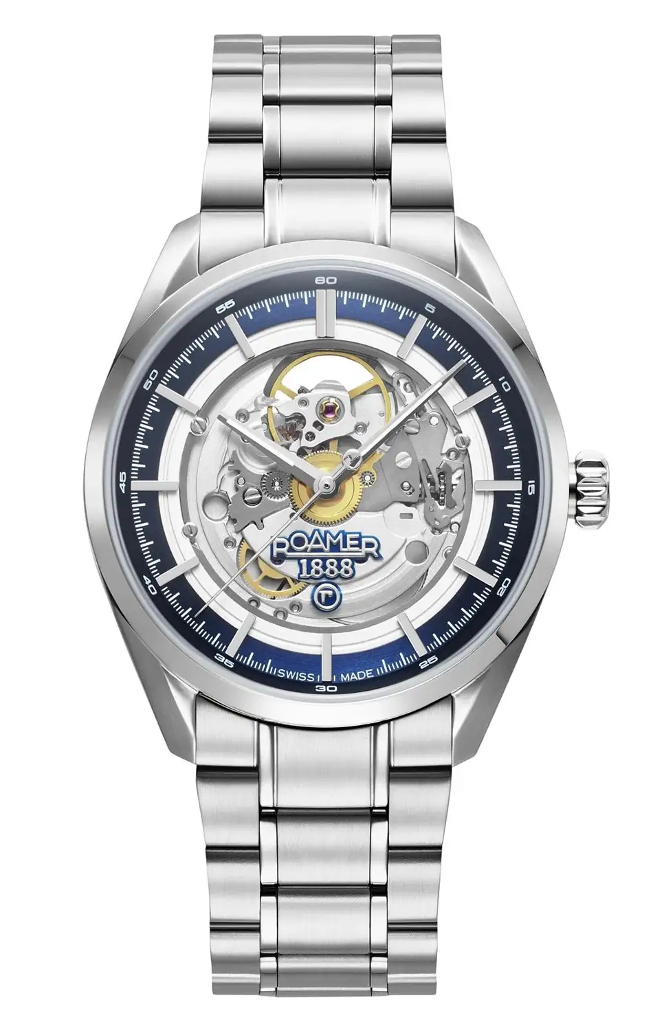 Hodinky s viditelným mechanismem Roamer 965985 41 45 20 odhalují krásu práce automatického strojku prostřednictvím skeletovaného ciferníku s tmavě modrým minutovým kroužkem. Složitost detailů, viditelná ozubená kola a otevřená konstrukce balancují mezi hodinářským mistrovstvím a moderní estetikou. Každý pohled na tyto hodinky připomíná neustálý pohyb – jejich srdce nejen bije, ale odhaluje celý svůj rytmus. Celek chrání safírové sklo, které je obtížné poškrábat.
