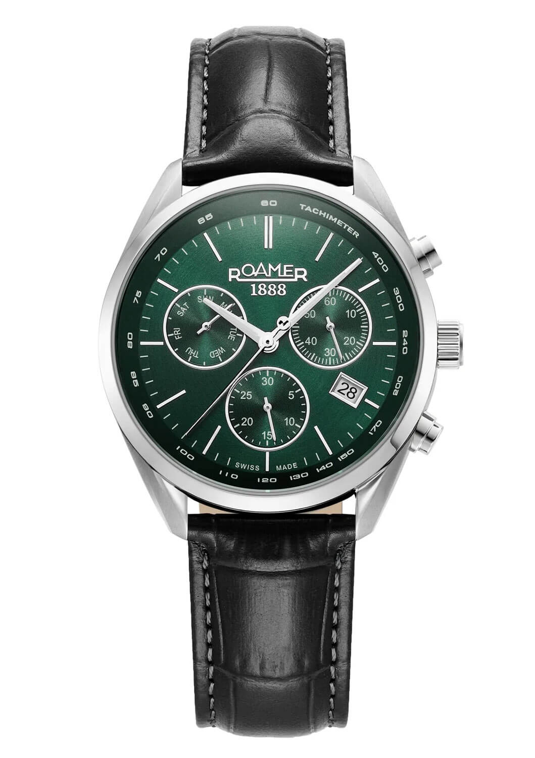 Sportovní hodinky Roamer Pro Chrono 993819417502 mají zelený ciferník se sportovním designem. Je vybaven dvěma subciferníky chronografu a třetím doplňkovým, který ukazuje den v týdnu. Ciferník se může pochlubit mimořádnou funkčností. Nechybí ani datumovka s dnem v měsíci a tachymetrická stupnice, která udává rychlost pohybu na vzdálenost 1 km. Díky akcentům svítícím ve tmě zůstávají hodinky čitelné i při slabém osvětlení. Celé to chrání těžko poškrábatelné safírové sklíčko, které zaručuje čitelnost a bezpečnost ciferníku.