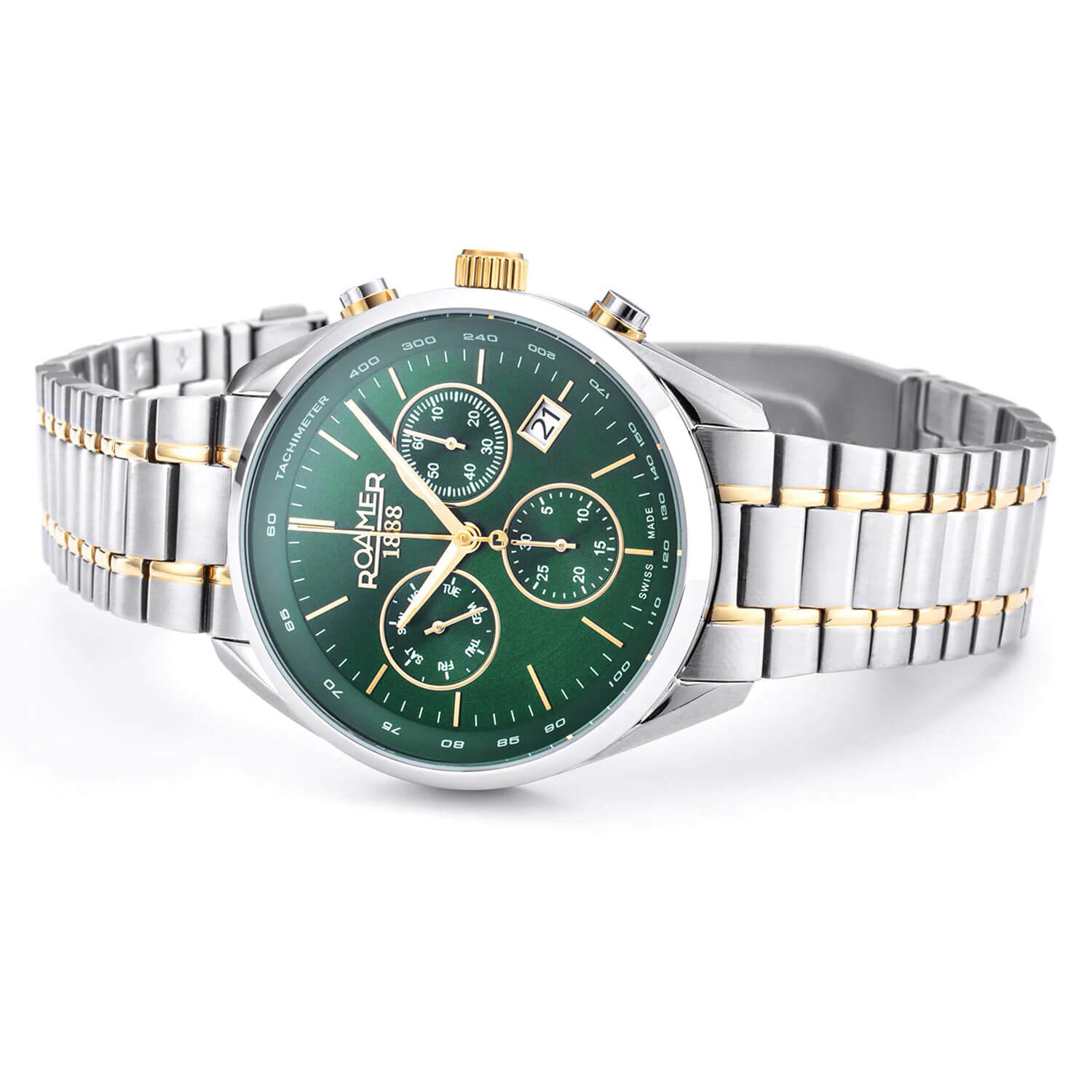 Sportovní hodinky Roamer Pro Chrono 993819477520 mají zelený ciferník se sportovním designem. Je vybaven dvěma subciferníky chronografu a třetím doplňkovým, který ukazuje den v týdnu. Ciferník stříbrných a zlatých hodinek Roamer se pyšní mimořádnou funkčností. Nechybí ani datumovka s dnem v měsíci a tachymetrická stupnice, která udává rychlost pohybu na vzdálenost 1 km. Díky akcentům svítícím ve tmě zůstávají hodinky čitelné i při slabém osvětlení. Celé to chrání těžko poškrábatelné safírové sklíčko, které zaručuje čitelnost a bezpečnost ciferníku.