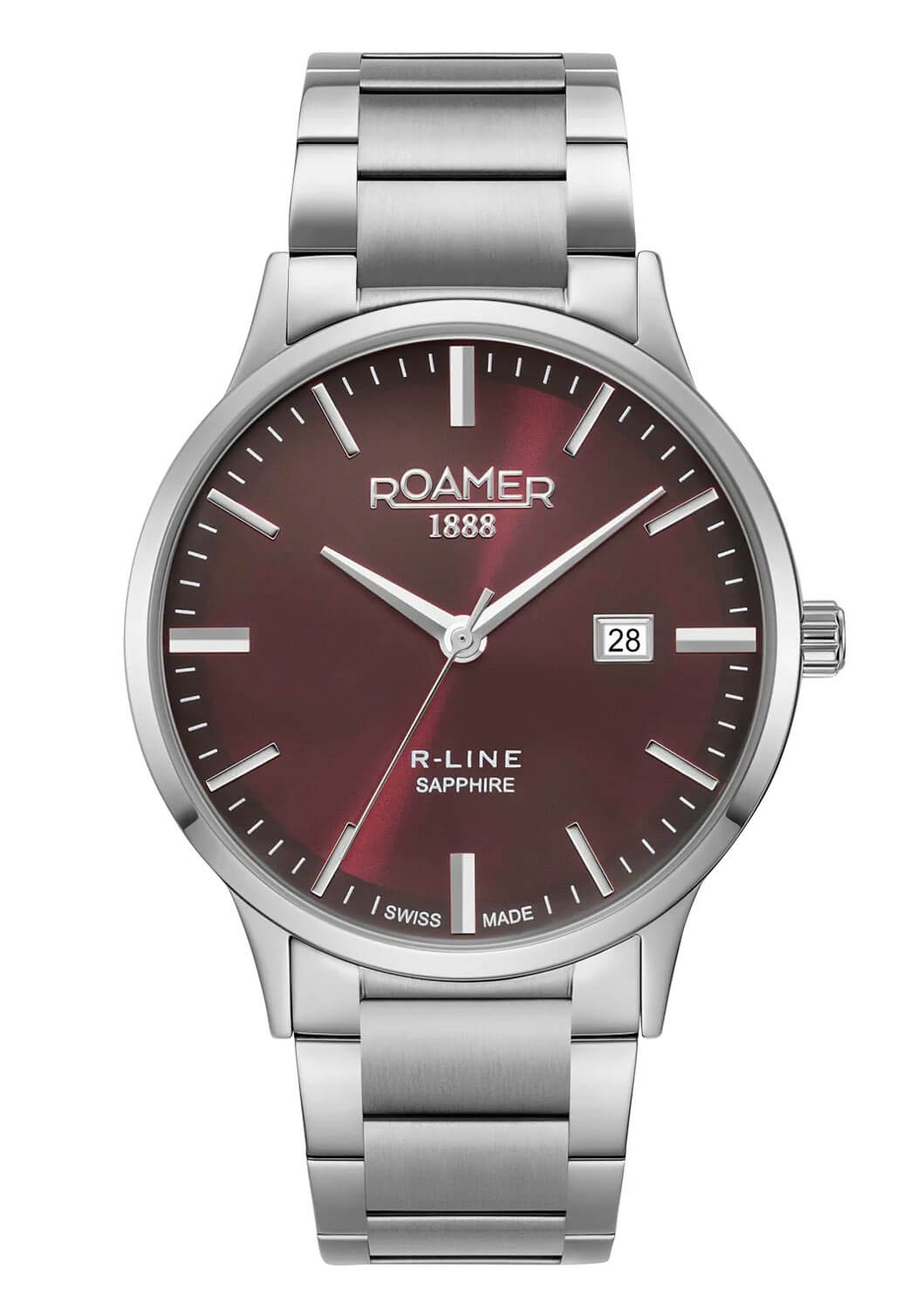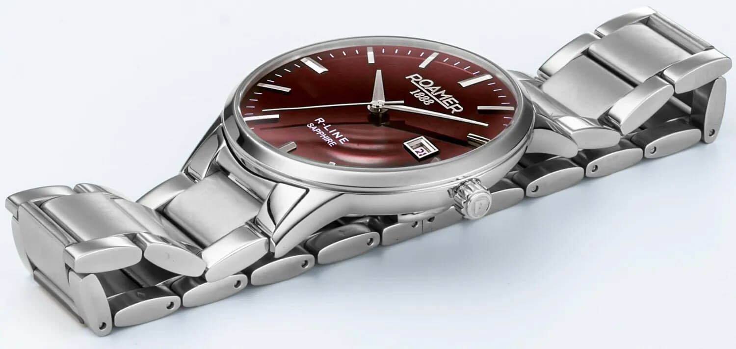 Ciferník hodinek Roamer má vkusně uspořádané stříbrné, lineární indexy, které dokonale ladí s klasickými ručičkami s elegantním a jednoduchým designem. Minimalistické indexy a decentní logo Roamer 1888, umístěné v horní části ciferníku, vytvářejí kompozici, která odráží vynikající řemeslnou zručnost a prestiž této švýcarské značky. K dispozici je diskrétní zobrazení data ve tři hodiny, které přináší další funkce při zachování symetrické a elegantní estetiky. Červený ciferník zakončený jemným saténovým efektem dodává celku rafinovanou záři, jemně odrážející světlo z různých úhlů. Díky tomuto luxusnímu detailu hodinky vynikají třídou a elegancí a přitahují pozornost při každé příležitosti.