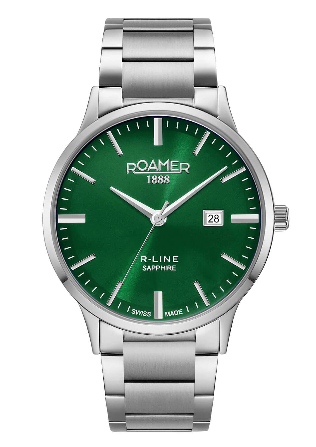 Na číselníku hodinek Roamer jsou elegantně rozmístěny stříbrné, liniové indexy, které dokonale ladí s klasickými ručičkami s elegantním a jednoduchým designem. Minimalistické indexy a jemné logo Roamer 1888, umístěné v horní části číselníku, tvoří kompozici, která odráží vynikající řemeslné zpracování a prestiž této švýcarské značky. Na pozici třetí hodiny se nachází nenápadný datumový ukazatel, který přináší další funkčnost, přičemž zachovává symetrickou a elegantní estetiku. Lahvově zelený číselník s jemným saténovým efektem dodává celkovému vzhledu sofistikovaný lesk a jemně odráží světlo pod různými úhly. Tento luxusní detail činí hodinky jedinečnými a elegantními a upoutá pohled při každé příležitosti.