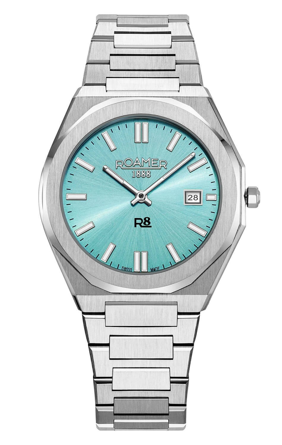 Pouzdro o průměru 41 mm je vyrobeno z kartáčované nerezové oceli, stejně jako plný náramek s integrovaným profilem. Ciferník typu sunray v odstínu ice blue se vyznačuje dobrou čitelností – nanesené indexy a ručky byly potaženy luminiscenční vrstvou, která svítí ve tmě. Na třetí hodině je umístěna datumovka a celý číselník chrání safírové sklíčko odolné proti poškrábání. Uvnitř pracuje švýcarský strojek Ronda, který zajišťuje spolehlivé měření času – bez nutnosti každodenního natahování nebo korekcí. Je to funkční a módní nabídka pro ty, kteří hledají něco svěžího, ale nepřehnaného.