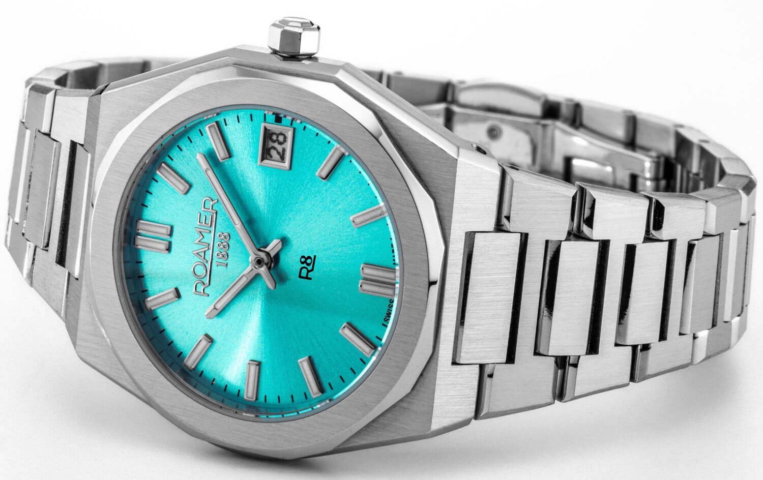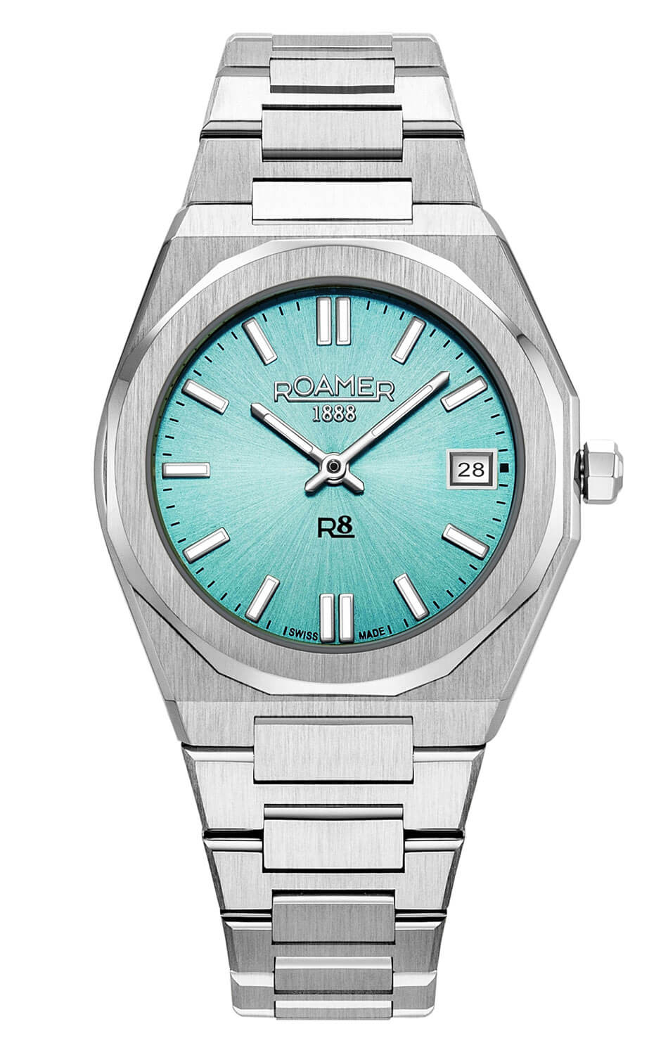 Dámské hodinky Roamer R8 Ladies 972857 41 05 20 jsou modelem, který se snadno uplatní v každodenním ženském stylu – moderním, ale nepřehnaném. Jemné pouzdro o průměru 33 mm dobře sedí na zápěstí a jeho výrazně tvarovaná forma dodává celku osobitost, aniž by ztrácel na subtilnosti. Ledově modrý ciferník se saténovou úpravou přináší svěží, lehký barevný akcent, který oživuje klasické stylizace, aniž by je dominoval. Pouzdro, ač jemné, má vysokou vodotěsnost až 100 metrů, což chrání vnitřní mechanismus i při plavání.