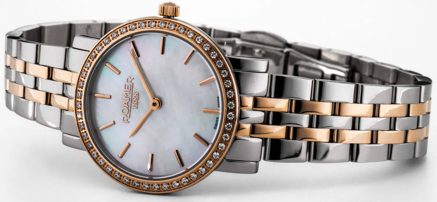 Tyto elegantní hodinky Roamer 976830 49 20 50 na dvoubarevném ocelovém náramku nejsou jen oslnivým doplňkem večerních outfitů – jejich komfortní konstrukce a odolné materiály je předurčují i pro každodenní nošení. Model je vybaven precizním švýcarským quartzovým strojkem Ronda Swiss Made, který zajišťuje bezúdržbový a přesný chod po dlouhá léta. Pouzdro o průměru 28 mm – ideálně přizpůsobené ženskému zápěstí – si zachovává jemné proporce a pevná ušlechtilá ocel 316L je odolná vůči korozi, vlhkosti a běžným podmínkám každodenního používání. Safírové sklíčko – známé svou vysokou tvrdostí – chrání perleťový ciferník před poškozením a náramek s motýlkovou sponou přidává eleganci i pocit jistoty při každém pohybu.