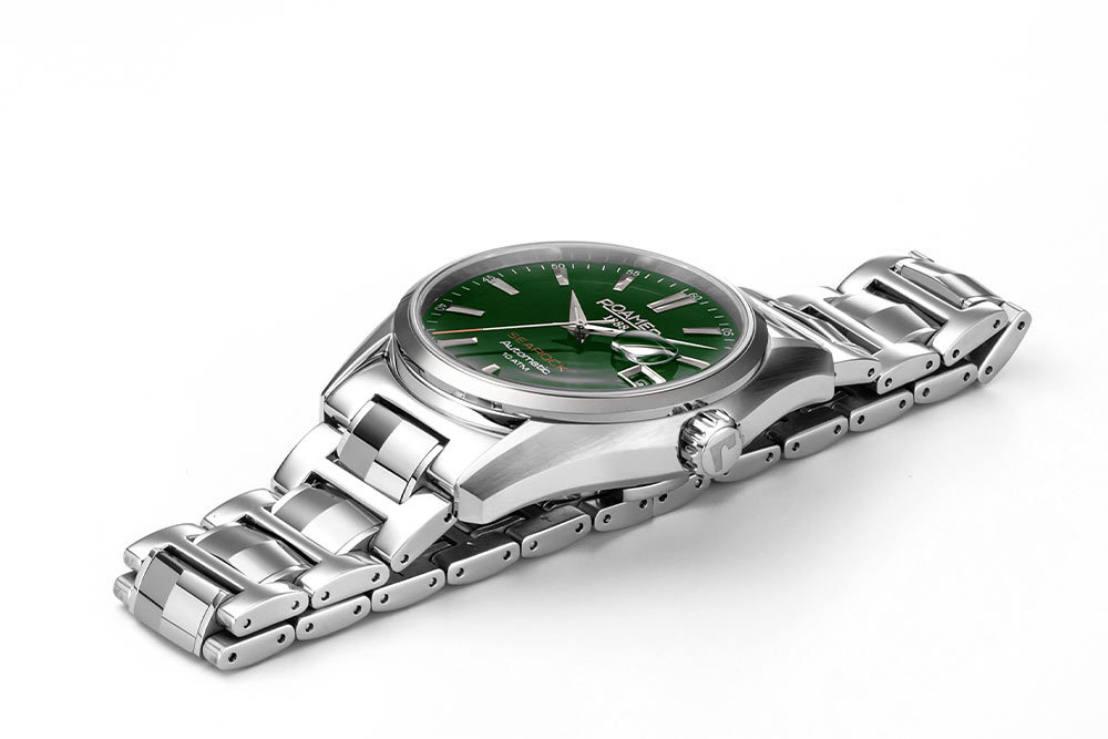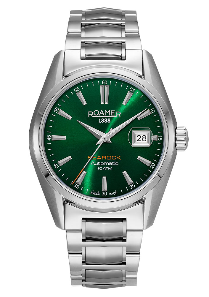 Dalším prvkem klasických hodinek Roamer Searock II je safírové sklo s antireflexní vrstvou. Zelený elegantní ciferník chrání průhledné, těžko poškrábatelné okénko. Je vybavena dýkovými ručičkami a indexy s diskrétní minutovou stupnicí. Ručičky mají pruhy pokryté svítící lumou, která vám pomůže odečítat čas ve slabších světelných podmínkách. Ve tři hodiny je funkce data, která informuje o aktuálním dni v měsíci. Užitečným doplňkem je lupa, která zvětšuje datumovku a usnadňuje její čtení. Ve 12 hodin je hrdé logo značky Roamer a v 18 hodin název kolekce Searock. Doprovází ho nápis automat, který připomíná mechanismus časomíry a 10 ATM, který informuje o její voděodolnosti.