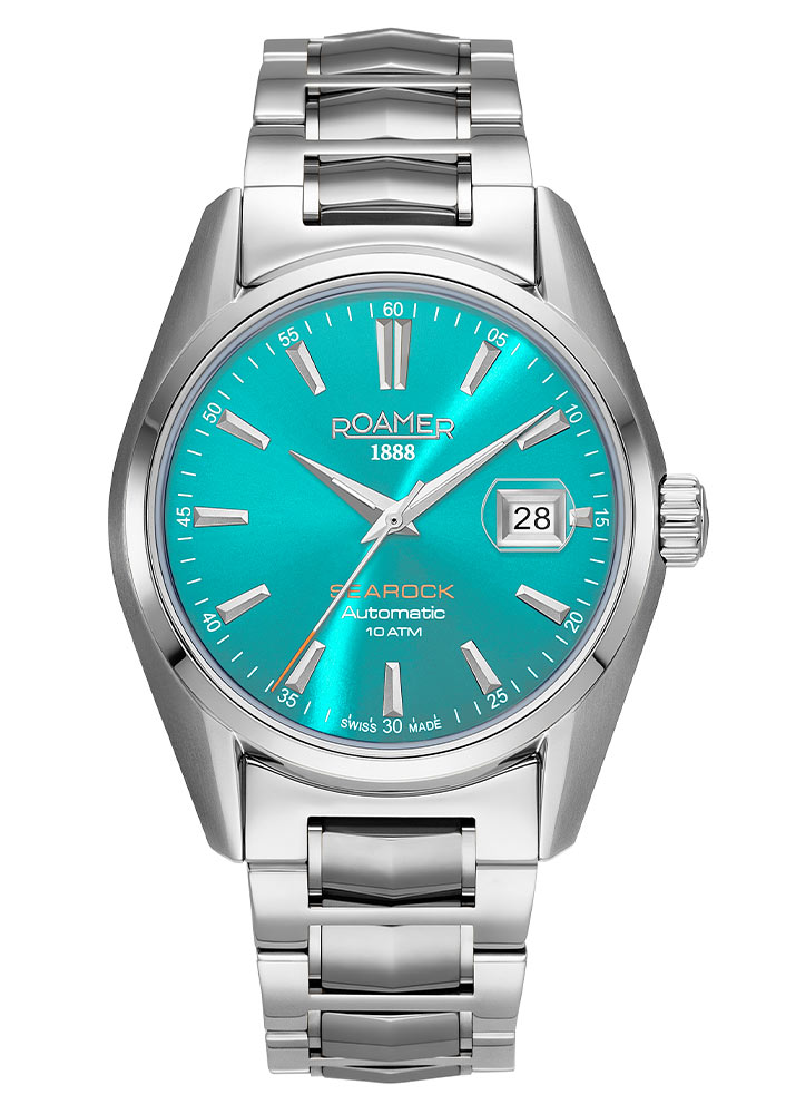 Dalším prvkem klasických hodinek Roamer Searock II je safírové sklo s antireflexní vrstvou. Modrý elegantní ciferník chrání průhledné, těžko poškrábatelné okénko. Je vybavena dýkovými ručičkami a indexy s diskrétní minutovou stupnicí. Ručičky mají proužky pokryté svítícím lume, který vám pomůže odečítat čas za horších světelných podmínek. Na pozici tří hodin je funkce data, která informuje o aktuálním dni v měsíci. Užitečným doplňkem je lupa, která zvětšuje datumovku a usnadňuje její čtení. Ve dvanáct hodin je hrdé logo značky Roamer a v šest pak název kolekce Searock. Doprovází ho nápis automat, který připomíná mechanismus hodinek a 10 ATM, který informuje o jejich voděodolnosti. Hodinky jsou utěsněny na 100 metrů, což vám umožní plavat bez obav z poškození mechanismu.