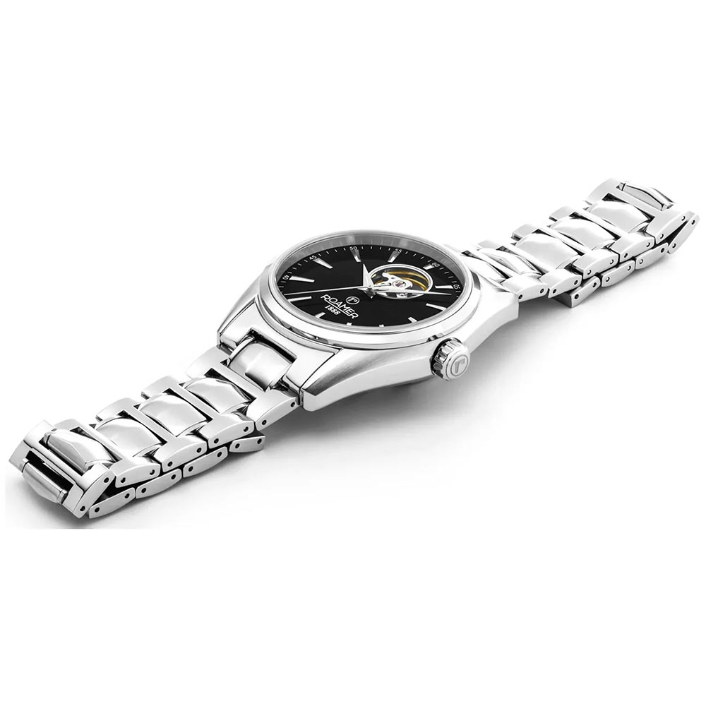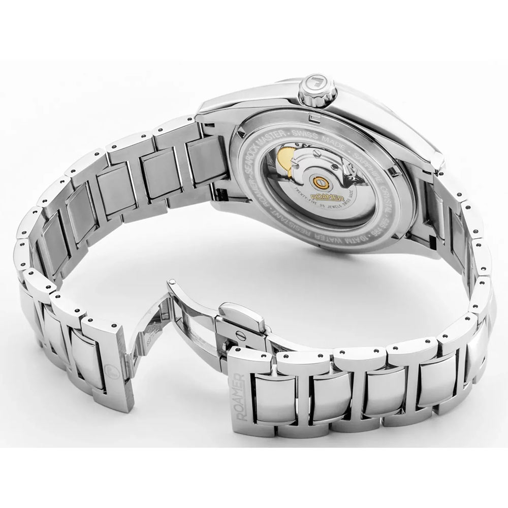 Pánské hodinky Roamer Master jsou novým objevem siluety hodinek Searock, již znají příznivci značky Roamer. Tentokrát Roamer představuje hodinky ve verzi s otevřenou váhou a průhledným krytem. Pánské hodinky Roamer Searock Master 984985 41 85 20 jsou nabízeny v pouzdru z nerezové oceli o průměru 42 mm. Ocel se vyznačuje vysokou odolností vůči různým druhům koroze. Korunka je klasicky umístěna na pravé straně pouzdra. Je šroubovací, což výrazně zvyšuje voděodolnost. Na zadní straně jsou hodinky zajištěny šroubovacím víčkem. Je průhledný, což umožňuje obdivovat činnost automatického mechanismu Soprod 024, který je srdcem tohoto modelu. Hodinky jsou spárovány s ocelovým náramkem s motýlkovým zapínáním. Bezpečně a pohodlně obepne zápěstí svého majitele.