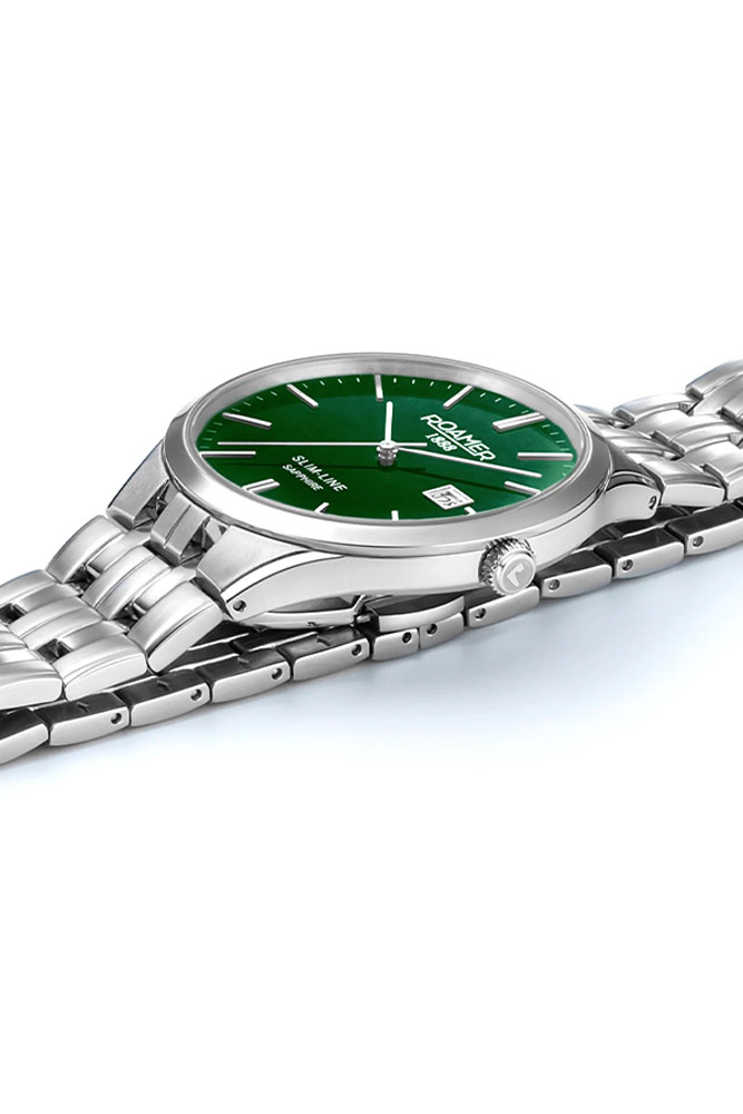 Hodinky pro pana Roamera Slim-Line Classic 512833 41 75 20 se vyznačují přísně klasickou siluetou prezentovanou v jednotných a kontrastních barvách. Neutrální stříbrná a lesní zelená použitá na náramku, pouzdru a úhledném ciferníku nenechá nikoho na pochybách, tyto hodinky jsou ikonou skutečné univerzální klasiky.