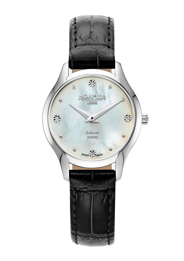 Přední stranu hodinek Roamer chrání tvrdé safírové sklíčko. Těžko poškrábatelné okénko chrání extrémně zdobený ciferník. Na kulatém ciferníku z perleti jsou umístěny čtyři oslnivé pravé diamanty. Diamanty jsou doplněny jemnými kulatými stříbrnými indexy. Aktuální čas ukazují štíhlé ručičky dýky. Pozici 12 hodin zdobí hrdé logo značky Roamer 1888 a pozici 6 hodin zdobí název kolekce Soleure Diamond. Unikátní design perleťového ciferníku kryje švýcarský mechanismus Ronda, který zaručuje velmi dobré měření času.