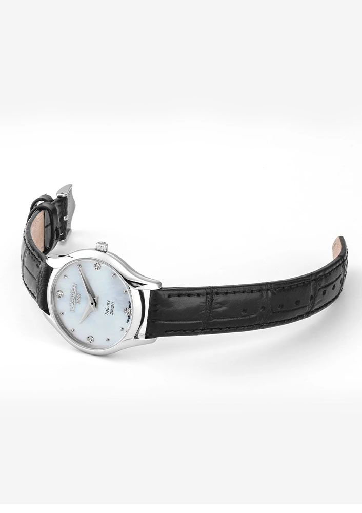 Dámské hodinky Roamer Soleure Diamond 547857 41 25 05 tvoří kulaté pouzdro vyrobené z nerezové oceli 316L. Luneta 30mm pouzdra se vyznačuje výřezy u oček, které obohacují design celého pouzdra. Na zadní straně je ocelový kryt, který je připevněn čtyřmi šrouby. Tyto elegantní dámské hodinky Roamer jsou spárovány s černým koženým řemínkem s exotickým vzorem. Řemínek je lehký a měkký, což zajišťuje pohodlí při používání hodinek. Lze jej zapnout pomocí tradiční přezky s jehlou.