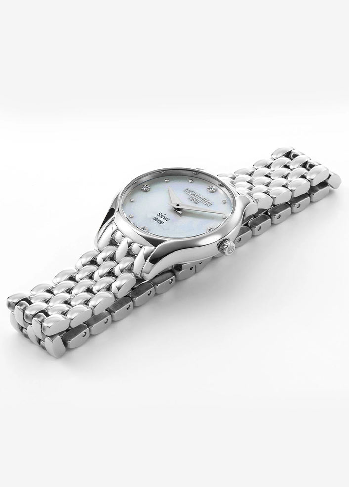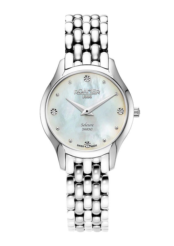 Přední stranu hodinek Roamer chrání tvrdé safírové sklíčko. Těžko poškrábatelné okénko chrání extrémně zdobený ciferník. Čtyři oslnivé pravé diamanty jsou umístěny na kulatém kotouči vyrobeném z perleti. Diamanty jsou doplněny jemnými kulatými stříbrnými indexy. Aktuální čas ukazují štíhlé ručičky dýky. Pozici 12 hodin zdobí hrdé logo značky Roamer 1888 a pozici 6 hodin zdobí název kolekce Soleure Diamond. Unikátní design perleťového ciferníku kryje švýcarský mechanismus Ronda, který zaručuje velmi dobré měření času.