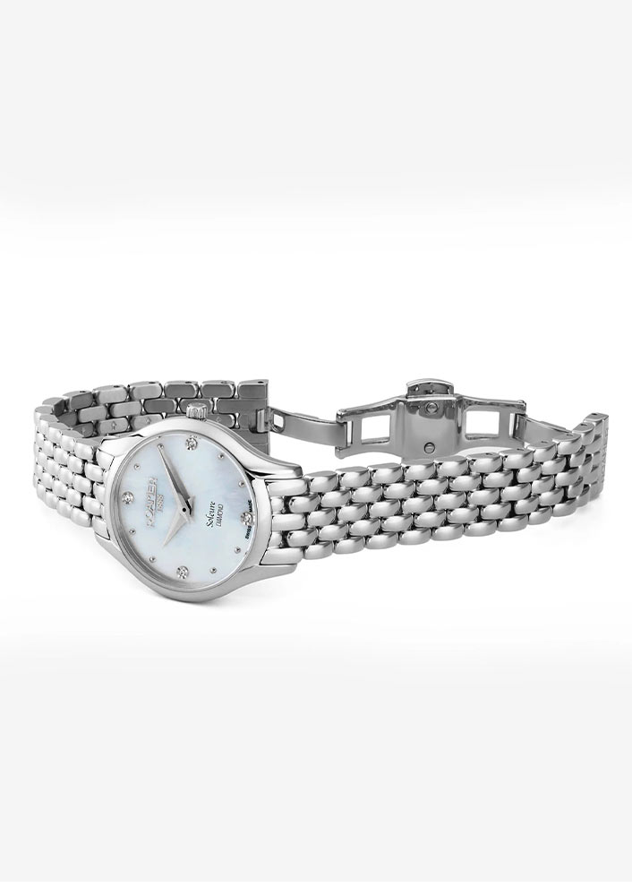 Švýcarská hodinářská značka Roamer vás zve k seznámení a přátelství s mimořádně elegantními hodinkami z kolekce Soleure Diamond pro sofistikované ženy. Na první pohled upoutají pozornost pravé diamanty osazené na perleťovém ciferníku. Hodinky Roamer Soleure Diamond jsou skutečně ženským doplňkem, který podtrhne vzhled své majitelky. Tyto módní hodinky budou dokonalým doplňkem každého dámského šatníku. Hodinky se budou hodit jak k lehkým šatům, tak k elegantním oblekům. Prezentovaný model hodinek Roamer s diamanty je šperkem pro zvláštní příležitosti i dokonalou každodenní ozdobou zápěstí.