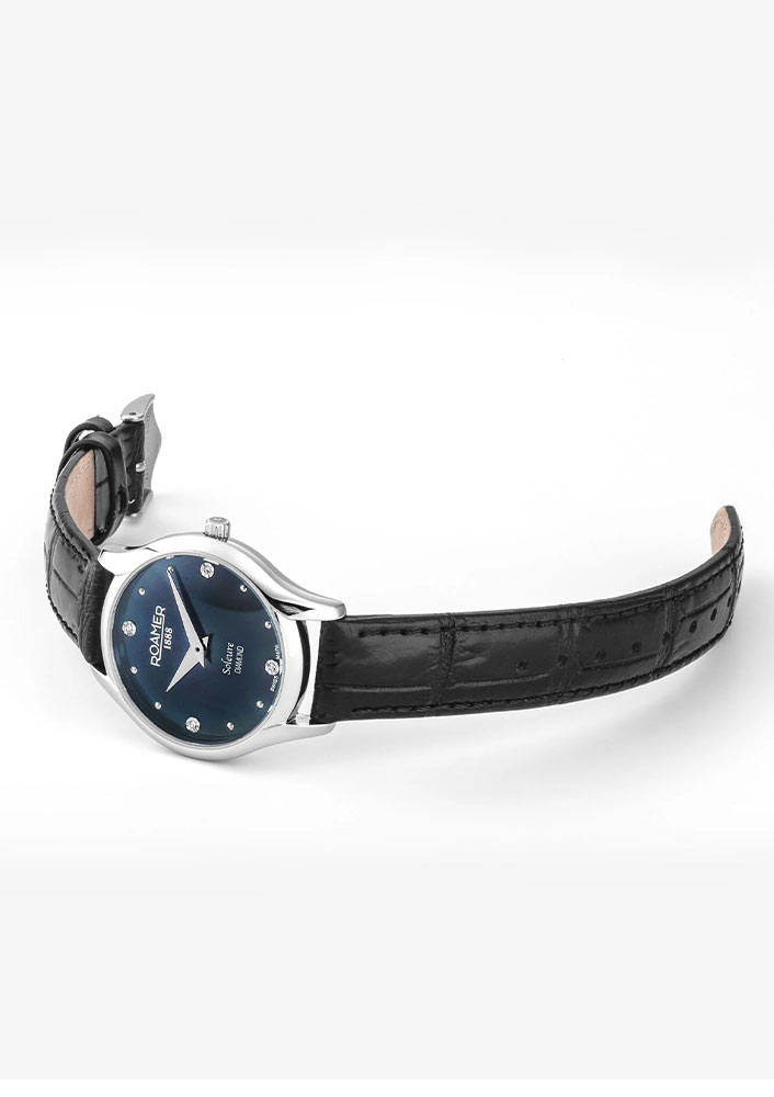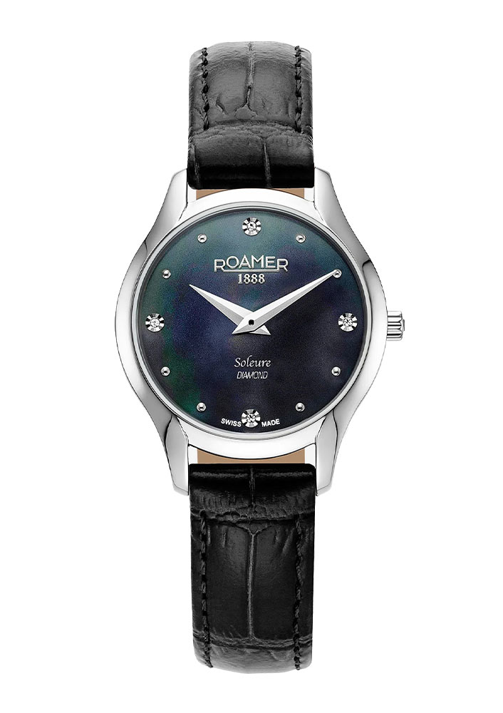 Přední stranu hodinek Roamer chrání tvrdé safírové sklíčko. Těžko poškrábatelné okénko chrání extrémně zdobený ciferník. Čtyři oslnivé pravé diamanty jsou umístěny na kulatém kotouči vyrobeném z perleti. Diamanty jsou doplněny jemnými kulatými stříbrnými indexy. Aktuální čas ukazují štíhlé ručičky dýky. Pozici 12 hodin zdobí hrdé logo značky Roamer 1888 a pozici 6 hodin zdobí název kolekce Soleure Diamond. Unikátní design perleťového ciferníku kryje švýcarský mechanismus Ronda, který zaručuje velmi dobré měření času.