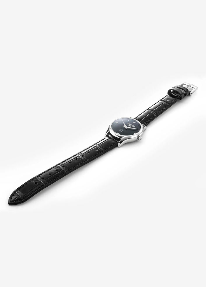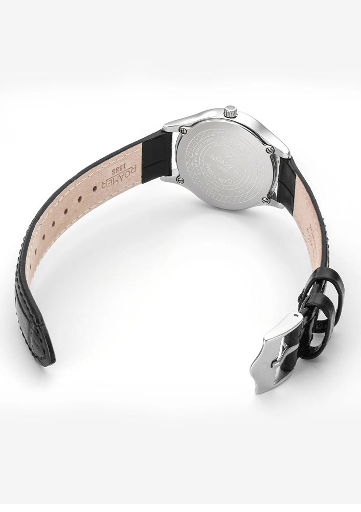 Dámské hodinky Roamer Soleure Diamond 547857 41 85 05 tvoří kulaté pouzdro vyrobené z nerezové oceli 316L. Luneta 30mm pouzdra se vyznačuje výřezy u oček, které obohacují design celého pouzdra. Na zadní straně je ocelový kryt, který je připevněn čtyřmi šrouby. Tyto elegantní dámské hodinky Roamer jsou spárovány s černým koženým řemínkem s exotickým vzorem. Řemínek je lehký a měkký, což zajišťuje pohodlí při používání hodinek. Lze jej zapnout pomocí tradiční přezky s jehlou.