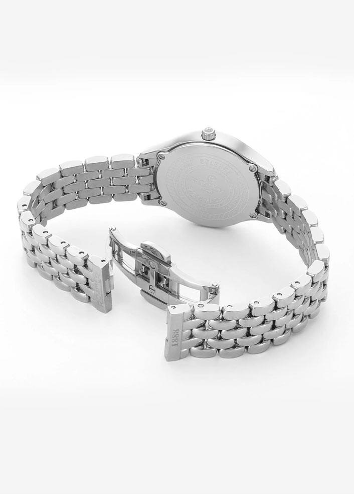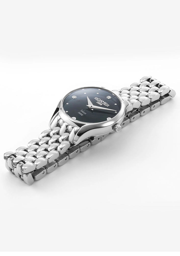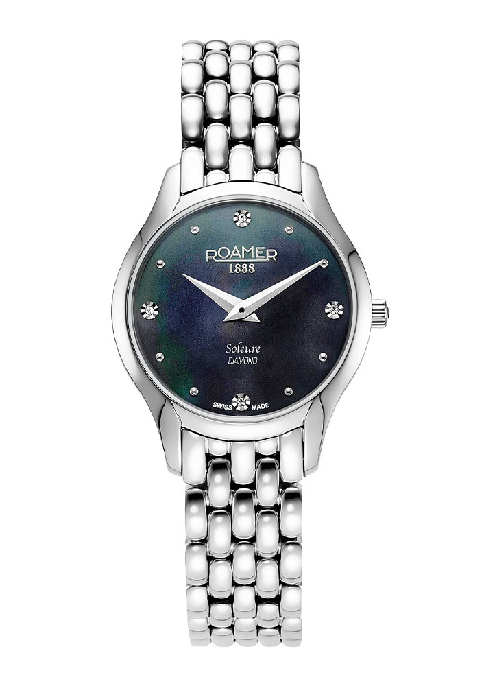 Přední stranu hodinek Roamer chrání tvrdé safírové sklíčko. Těžko poškrábatelné okénko chrání extrémně zdobený ciferník. Čtyři oslnivé pravé diamanty jsou umístěny na kulatém kotouči vyrobeném z perleti. Diamanty jsou doplněny jemnými kulatými stříbrnými indexy. Aktuální čas ukazují štíhlé ručičky dýky. Pozici 12 hodin zdobí hrdé logo značky Roamer 1888 a pozici 6 hodin zdobí název kolekce Soleure Diamond . Unikátní design perleťového ciferníku kryje švýcarský mechanismus Ronda, který zaručuje velmi dobré měření času.