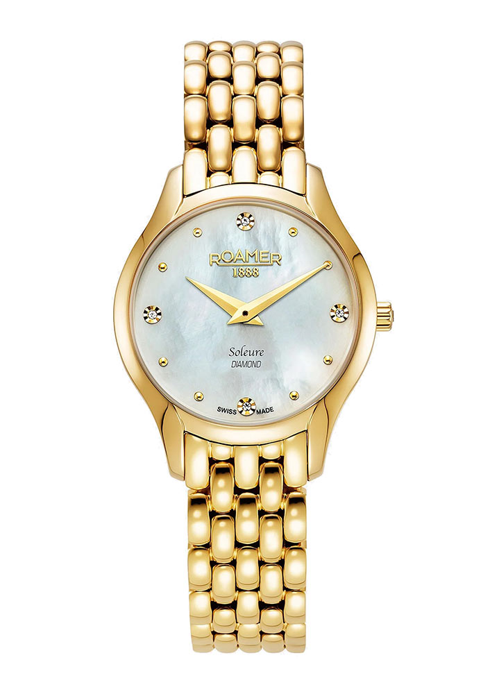 Přední stranu hodinek Roamer chrání tvrdé safírové sklíčko. Těžko poškrábatelné okénko chrání extrémně zdobený ciferník. Čtyři oslnivé pravé diamanty jsou umístěny na kulatém kotouči vyrobeném z perleti. Diamanty jsou doplněny jemnými kulatými stříbrnými indexy. Aktuální čas ukazují štíhlé ručičky dýky. Pozici 12 hodin zdobí hrdé logo značky Roamer 1888 a pozici 6 hodin zdobí název kolekce Soleure Diamond. Unikátní design perleťového ciferníku kryje švýcarský mechanismus Ronda, který zaručuje velmi dobré měření času.