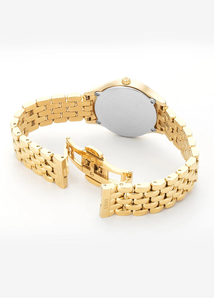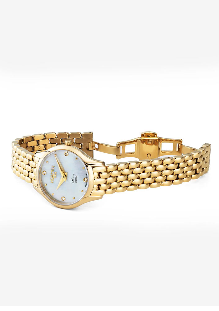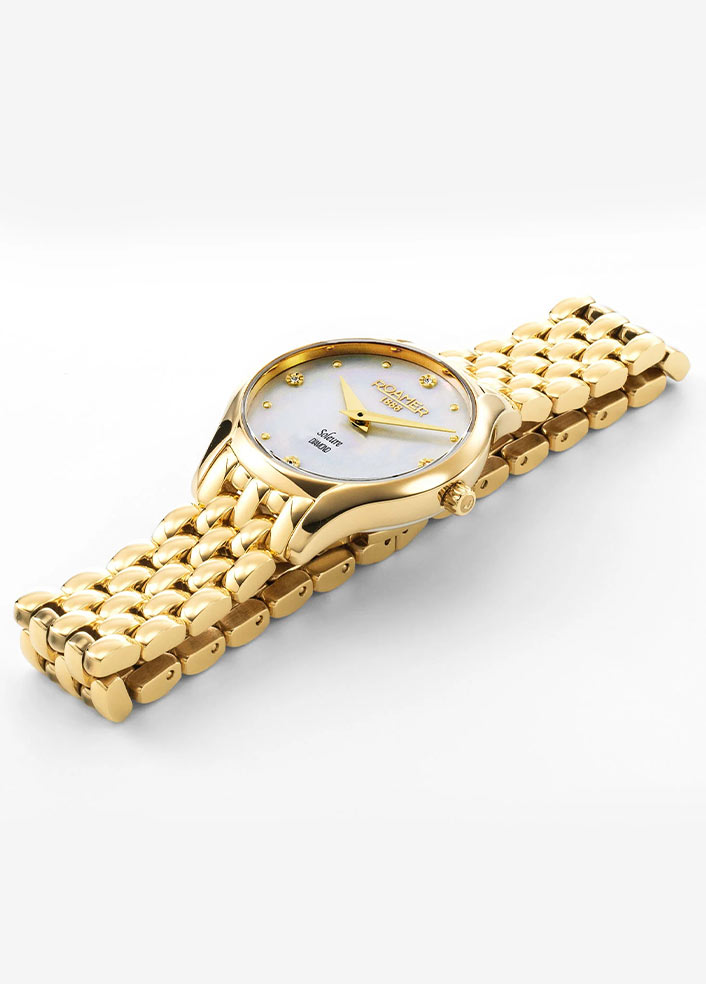 Dámské hodinky Roamer Soleure Diamond 547857 48 25 50 tvoří kulaté pouzdro vyrobené z nerezové oceli 316L ve zlatém PVD. Luneta 30mm pouzdra se vyznačuje výřezy u oček, které obohacují design celého pouzdra. Na zadní straně je ocelový kryt, který je připevněn čtyřmi šrouby. Tyto elegantní dámské hodinky Roamer jsou spárovány s pozlaceným ocelovým náramkem. Jsou opatřeny motýlkovou sponou, která zajišťuje pohodlí při používání hodinek.