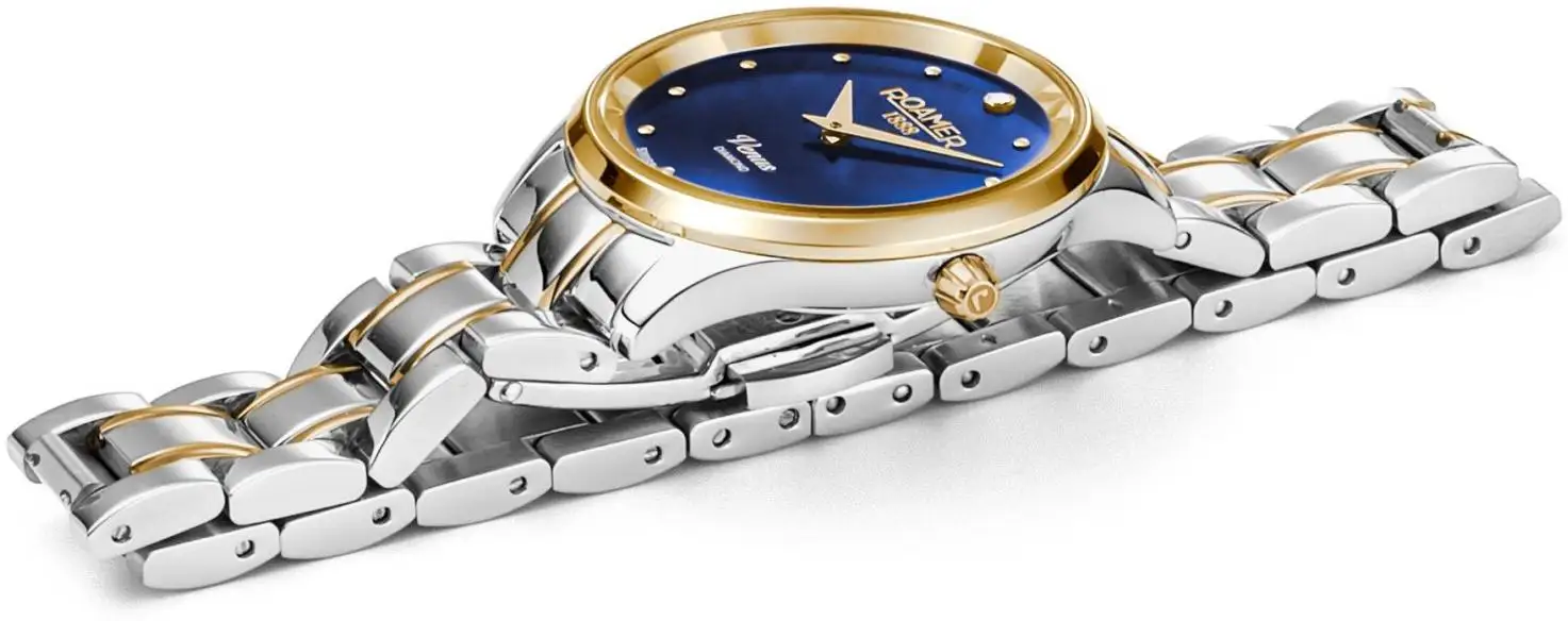 Krásné dámské hodinky Roamer v dvoutónovém provedení. Číselník z perleti s oslnivým diamantem. Šperkový časoměřič ve velikosti 30 mm. Vybavený safírovým sklem a švýcarským strojkem.