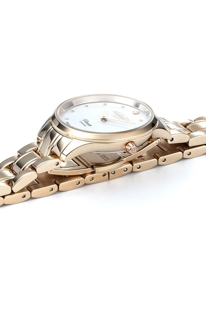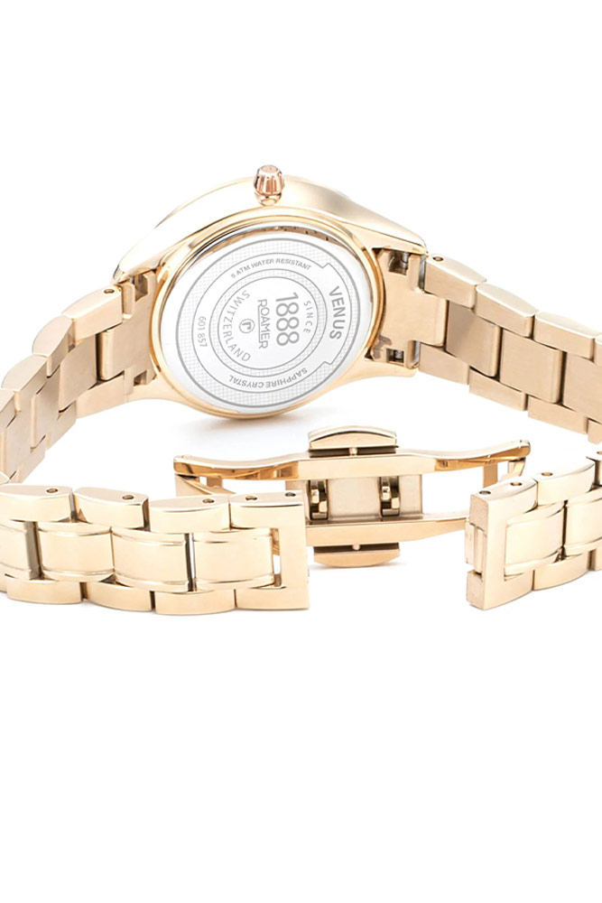 Roamer Venus Diamond jsou elegantní dámské hodinky na zlatém náramku z vysoce kvalitní nerezové oceli, pokryté odolným IP iontovým povlakem na ručičkách, indexech, lunetě a článcích. Ciferník je krytý nejkvalitnějším safírovým sklem, které nepoškrábe. Robustní pouzdro o průměru 30 milimetrů kompetentně chrání švýcarský quartz strojek (na baterie) uvnitř. Ciferník zaujme třpytivými odstíny bílé perleti a diamantem zasazeným na pozici 12 hodin jako korunovační klenot. I název kolekce umístěný pod leštěnými náznaky se zkosenou hranou je vizuálně atraktivní.
