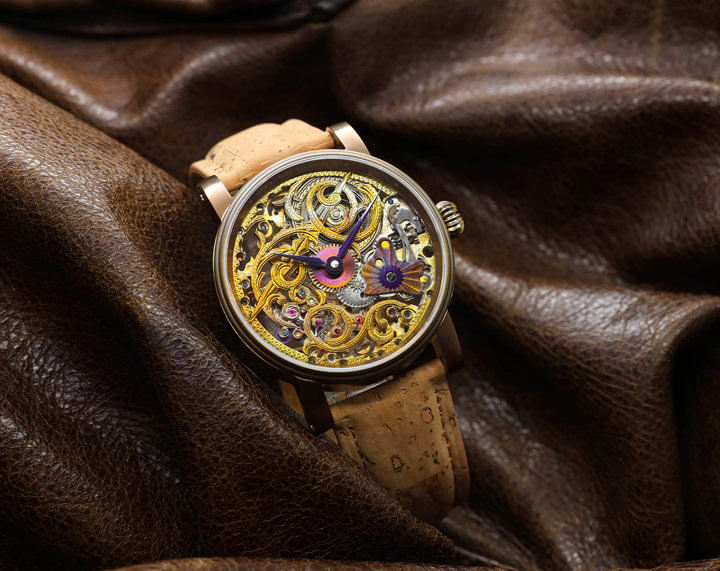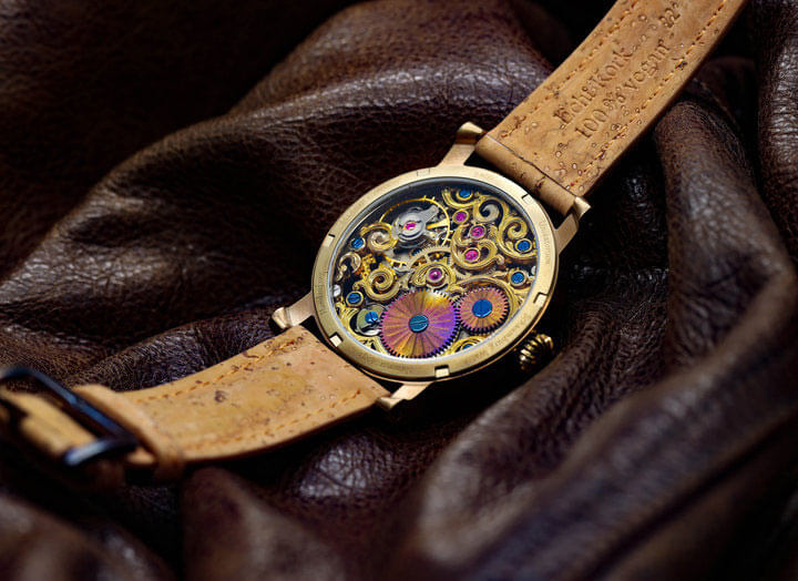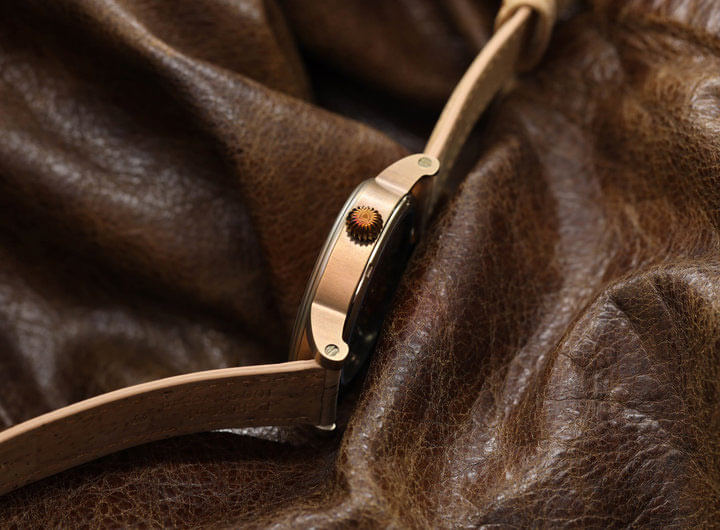 Materiály použité při výrobě Schaumburg Arrow of Fortune jsou stejně jedinečné jako příběh samotných hodinek. Pouzdro je vyrobeno z vysoce kvalitní nerezové oceli, která byla ručně patinována a tepelně barvena. Díky tomuto procesu získává každé pouzdro individuální vzhled, který se neopakuje u žádného jiného kusu. Zlatá barva pouzdra, dosažená přirozenými metodami, přitahuje pozornost a dodává hodinkám výjimečný charakter. Dalším prvkem, který tento model odlišuje, je řemínek vyrobený z pravého korku. Tento veganský materiál je nejen ekologický, ale také lehký a pohodlný na nošení, což činí hodinky Schaumburg ideální volbou pro ty, kteří dbají na životní prostředí. Řemínek je zakončen patinovanou a tepelně barvenou sponou, která dokonale ladí s pouzdrem a zdůrazňuje soudržnost designu.