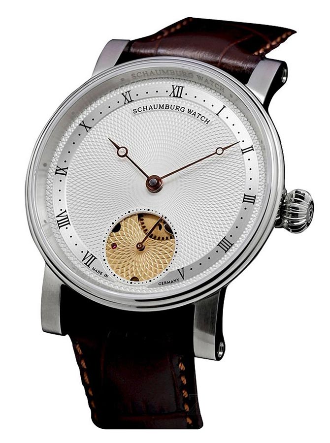 Klasické římské hodinky Schaumburg Classic Roman SCH-UNCR zaujmou již na první pohled svým dokonale zpracovaným bílým gilošovaným číselníkem se zlatým skeletovým sekundovým subciferníkem. Jeho trojrozměrná textura byla navíc překryta saténovým prstenem, který zase obsahuje elegantní římské číslice, které jdou ruku v ruce s tečkami označujícími minuty. Na pozici 6 hodin je tier přerušen pozlacenou vteřinovou ručičkou. Indikace jsou štíhlé a obsahují kosterní kruhy, každý zbarvený do zlata. Celek korunuje exkluzivní plíšek s podpisem výrobce a chrání jej nejkvalitnější safírové sklíčko téměř bez škrábanců.