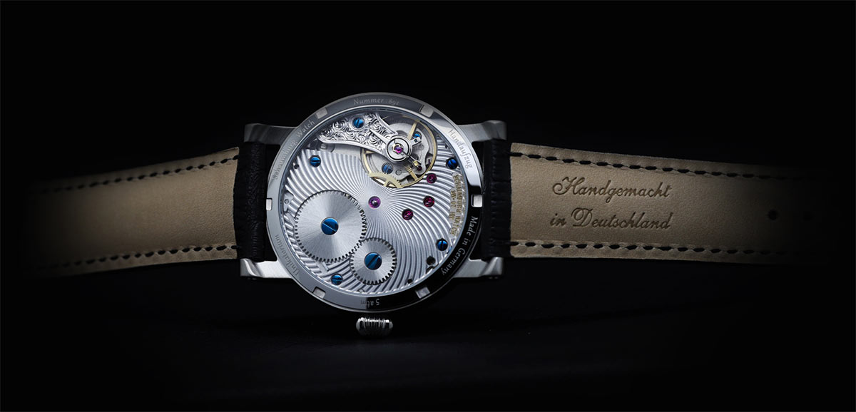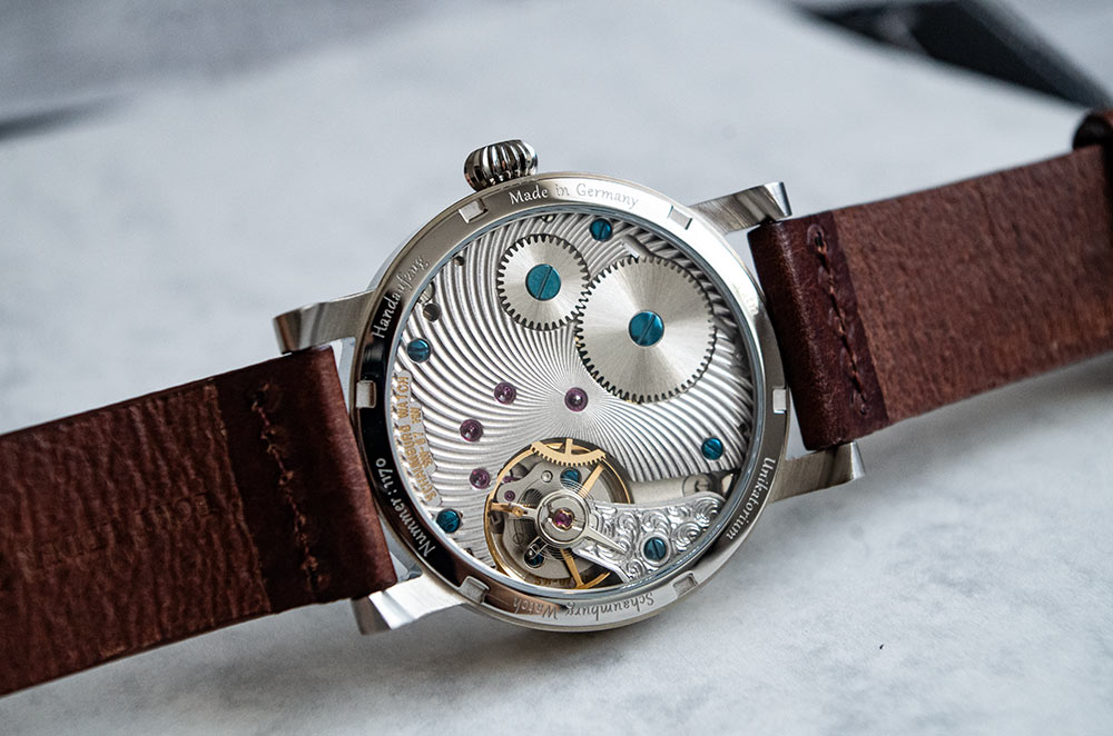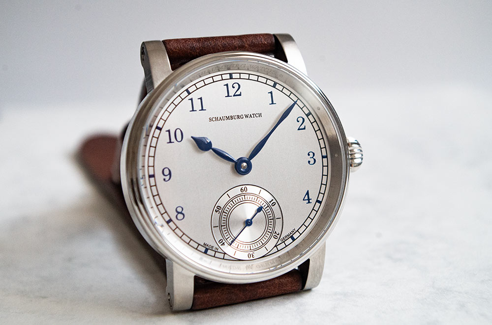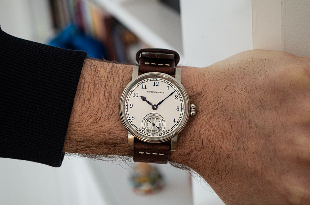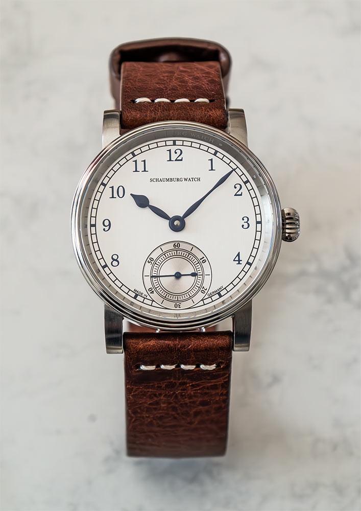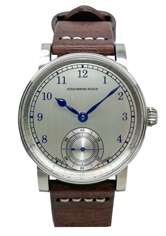 Model Marine má velmi zajímavý stříbrný ciferník. Tmavě modré arabské indexy odkazují na retro ručičky. Ostatní nápisy a stupnice jsou v černé barvě. Stříbrný ciferník zdobí sotva viditelný vertikální vzor, který dodává eleganci. Pouzdro z nerezové oceli o tloušťce 42 mm je matné, kromě leštěné lunety a šroubovací zadní části pouzdra, která je glazovaná. Krásně zdobené spirálovým mechanismem, modrými šrouby a zdobeným mostem. Všechny ozdoby jsou ručně vyráběny specialisty Schaumburg . Hodinky jsou spárovány s ručně šitým hnědým páskem s béžovým prošíváním.
