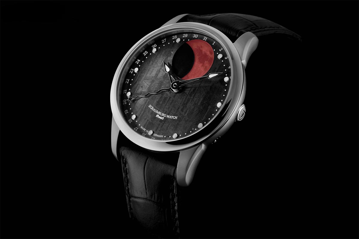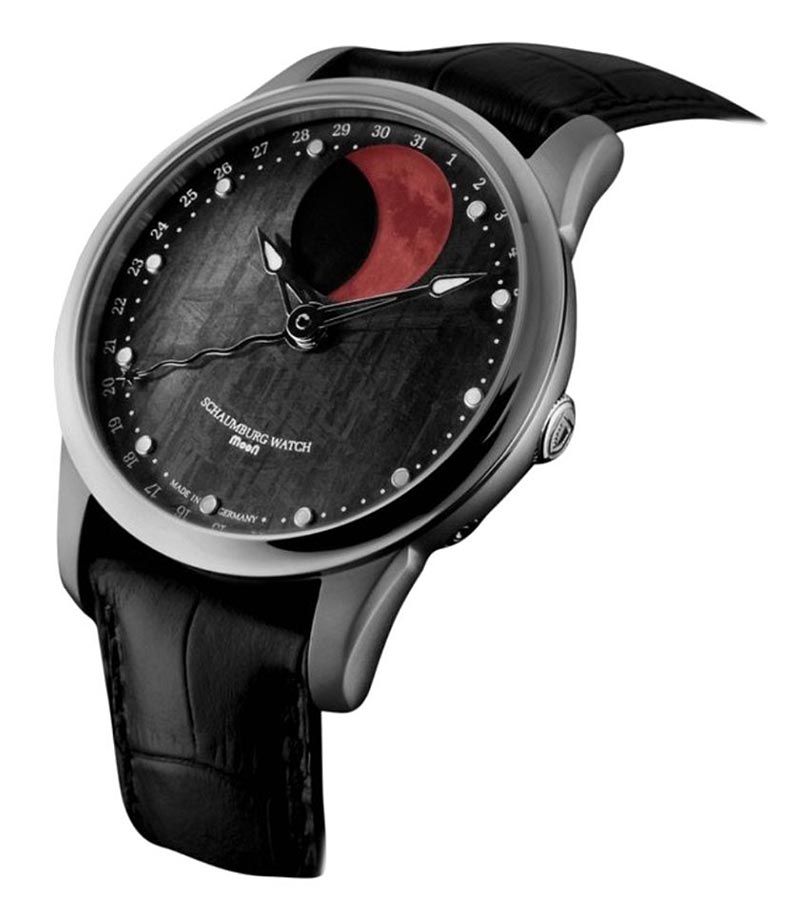 Hodinky Schaumburg SCH-MNMEB navrhl majitel společnosti a ručně je vyrobili němečtí specialisté v malé továrně v Rintelnu. Tato skutečnost odráží jistotu pozornosti ke každému detailu a vložení srdce do jediné kopie. Modely z kolekce MooN jsou vytvořeny ve vizi vysokého realismu postavy Měsíce, která je zároveň funkcí věčného indikátoru lunární fáze a originální atrakcí. Druhou částí vize je vypracovat co nejvyšší přesnost této komplikace. Díky nasazení, vášni a dlouholetým zkušenostem hodinářů vyrábějících hodinky Schaumburg zajišťuje originál upravený „Blood Moon“ téměř absolutní přesnost chronometru. Teprve po 122,5 letech se lunární cyklus odchýlí od skutečného o jeden den. Jedinečnost a luxus tohoto modelu je proto založen na jeho jedinečném vzhledu a také na vyspělé technologii, kterou značka využívá pro potřeby své maloobchodní značky.
