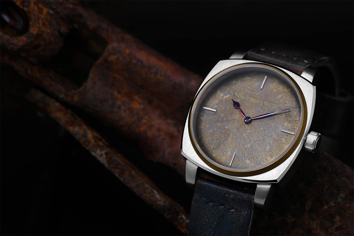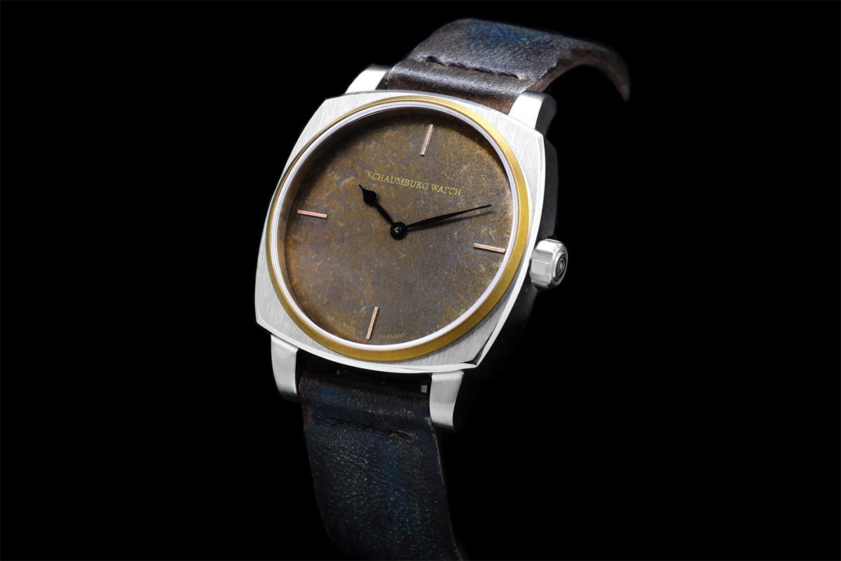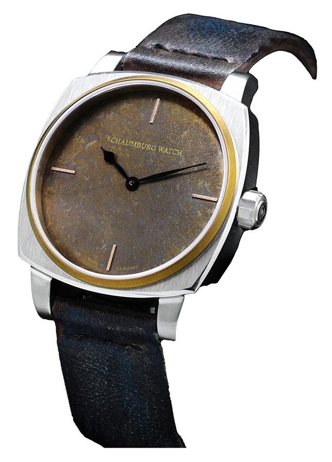 Model Schaumburg SCH-SQU je zcela unikátním uměleckým dílem díky ručním způsobům výroby a povrchové úpravy ciferníku a jeho komponentů, pouzdra s lunetou, řemínku a nakonec i samotného Machineku. Je to především nabídka určená mužům, kteří mají rádi doplňky s vlastním jedinečným charakterem, sběratelům a příznivcům ručních prací. Textura ciferníku ukazuje specifický, "ničící" pigment získaný patinováním. Dekorativní indikace, dalekohled a hodinky viditelné na skleněném rubu září avantgardními odstíny díky tepelnému barvení. Rotor je dodatečně rhodiován. Řemínek, na kterém je pouzdro umístěn, je rovněž patinován a šit celý ručně v dílně Schaumburg.