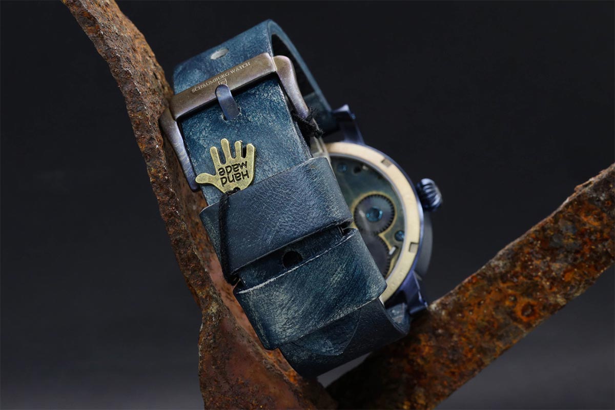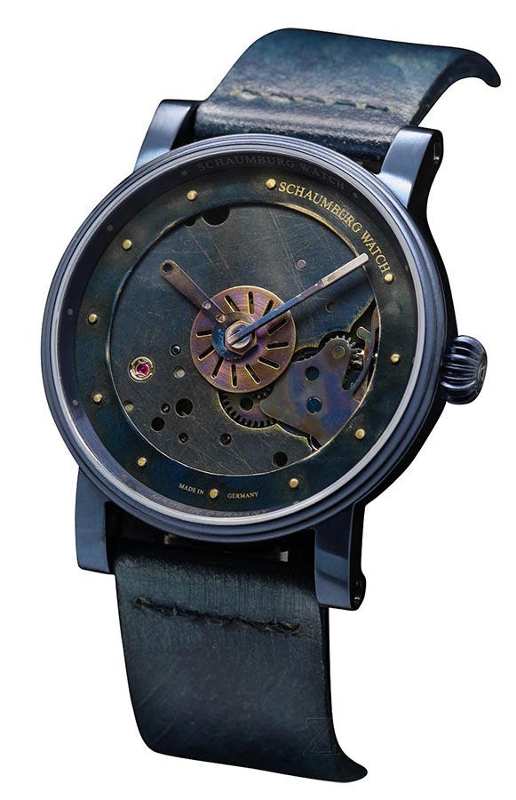 Schaumburg SteamPunk II SCH-STII je zavěšen na vintage modrém koženém řemínku. Klimatizovaný, patinovaný ciferník s viditelným syntetickým rubínem a patinovanými znaky ve vzoru klávesy SteamPunk je chráněn kvalitním safírovým sklem téměř bez škrábanců. Pouzdro o průměru 42 mm je vyrobeno z nerezové oceli a má tmavě modrý lesklý iontový povlak. Machineek se speciálními můstky, který je vidět přes 50 m voděodolnou vitrínu, je ručně natahovaný, jeho ráže SW-07.1 (váha ETACHRON, včetně ochrany Incabloc, 3/4 kobylka).