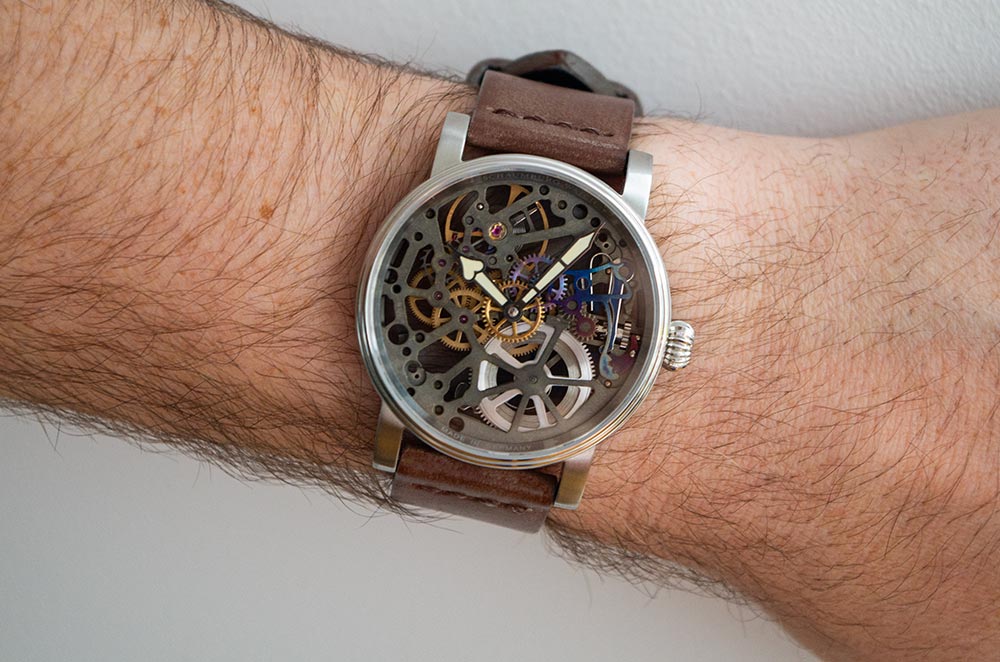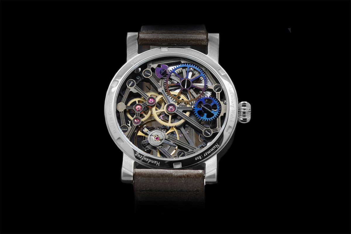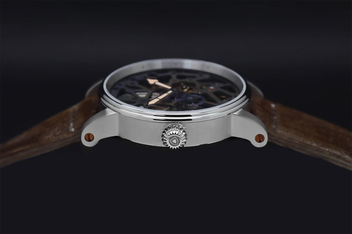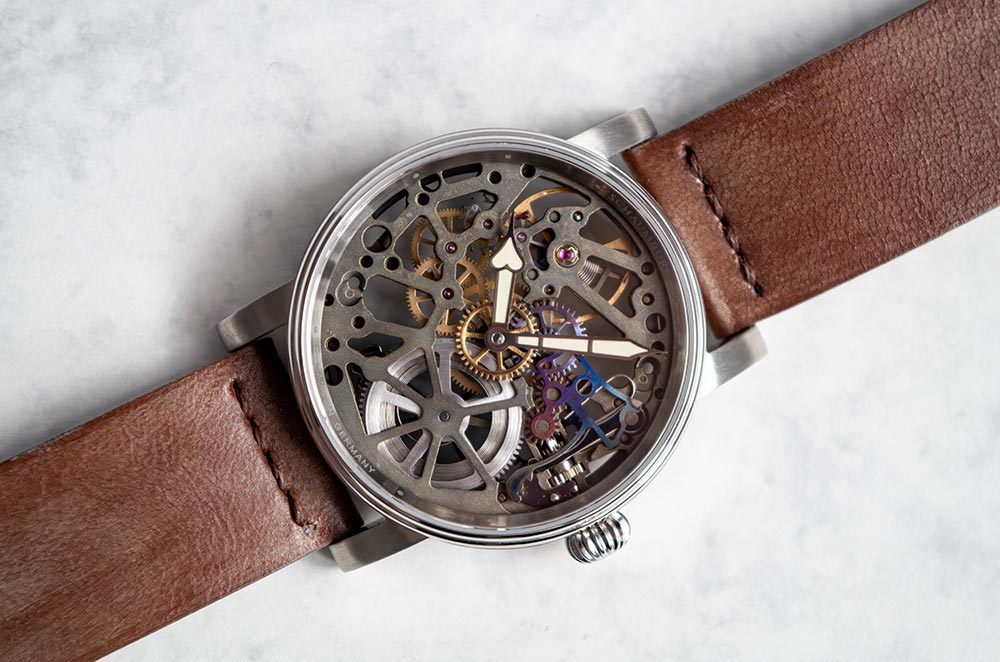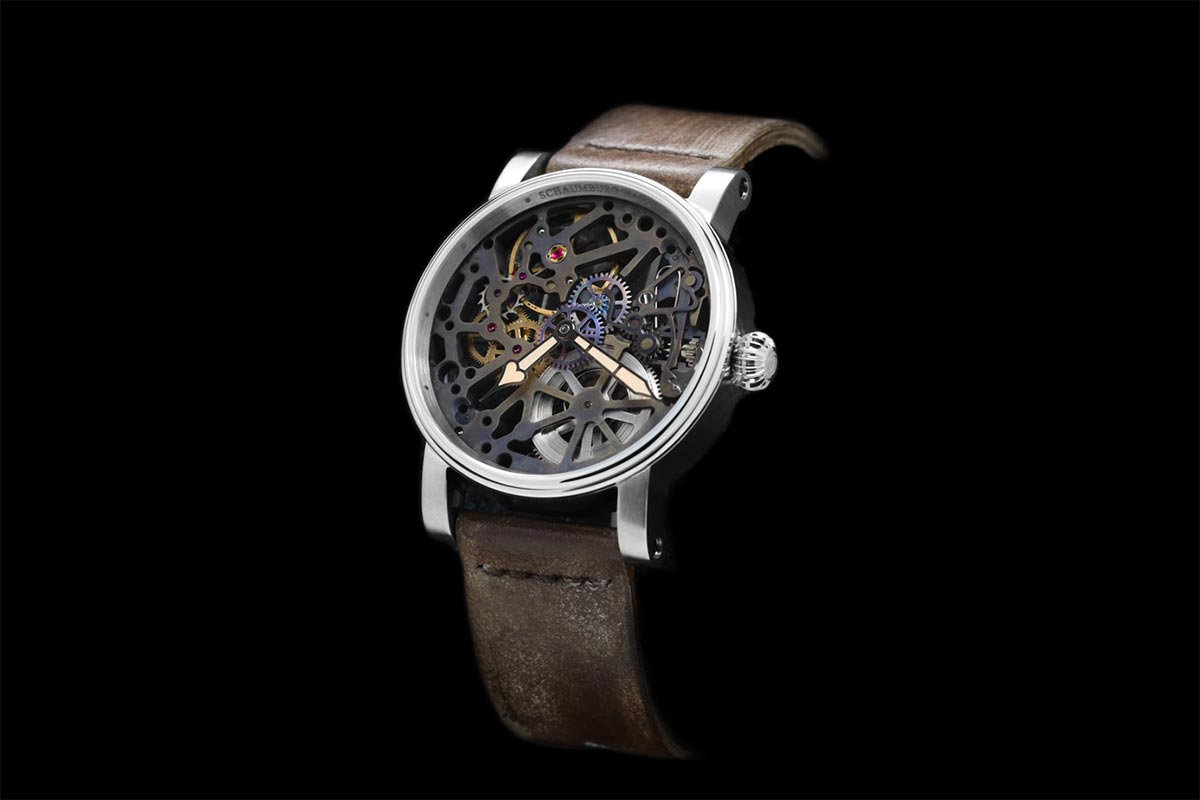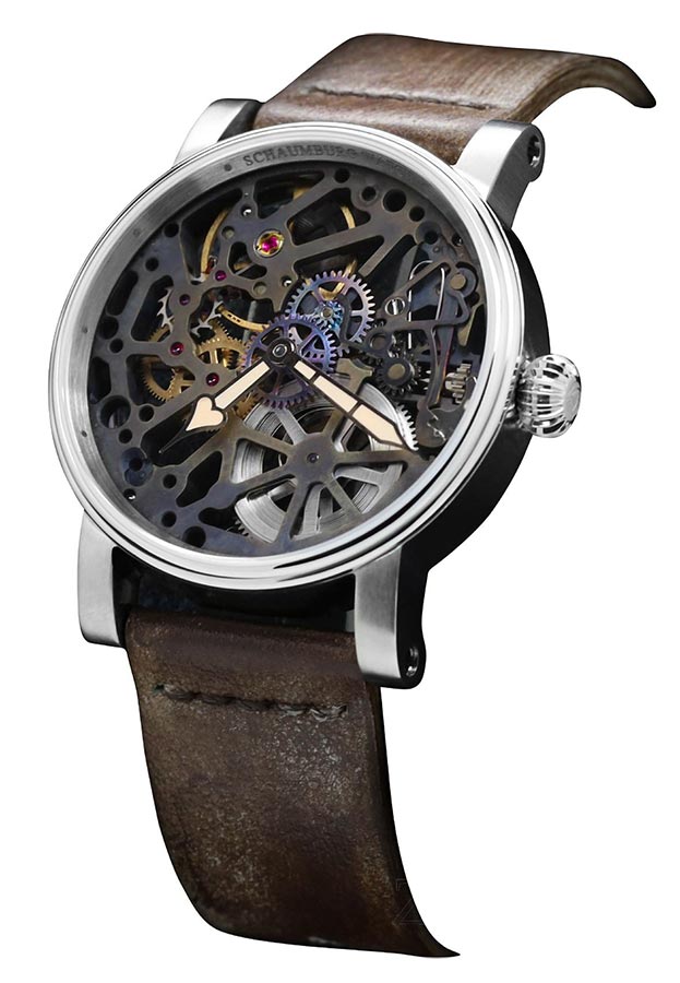 Schaumburg Unikatorium Old Bridge nemá typický ciferník času, ale místo toho jej nahrazuje fascinující pohled na speciálně letitý a plně ručně vyrobený a skeletonizovaný Schaumburgův ručně natahovaný Machineek. Většina jeho prvků, jako je řemínek, byla patinována, díky čemuž je každý kus jedinečný. Patinované prvky budou časem měnit své odstíny v závislosti na frekvenci používání a prostředí, ve kterém budou hodinky umístěny.