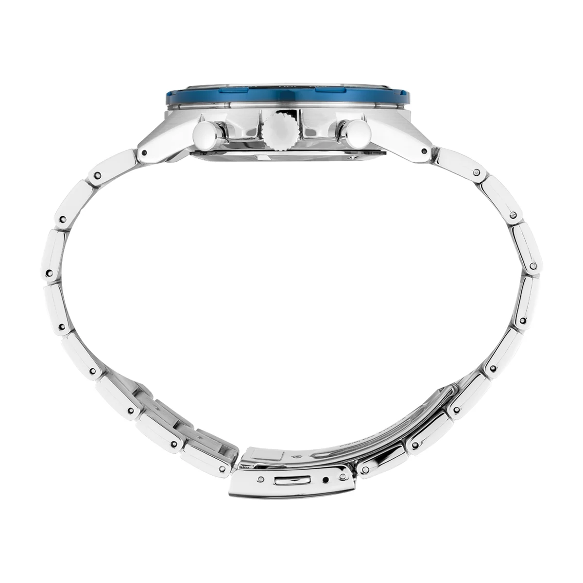 Nejvýraznějším prvkem hodinek je vícevrstvý ciferník v odstínu modré. Jeho struktura kombinuje broušené plochy, precizní gilošování a matné segmenty, čímž vytváří trojrozměrný efekt, který se v této cenové kategorii vyskytuje jen zřídka. Trojité subciferníky vynikají ocelovými kroužky a oranžovými akcenty, které dodávají celku energii. Indexy jsou masivní a výrazné a jejich uspořádání i proporce zajišťují vynikající čitelnost navzdory bohaté formě.