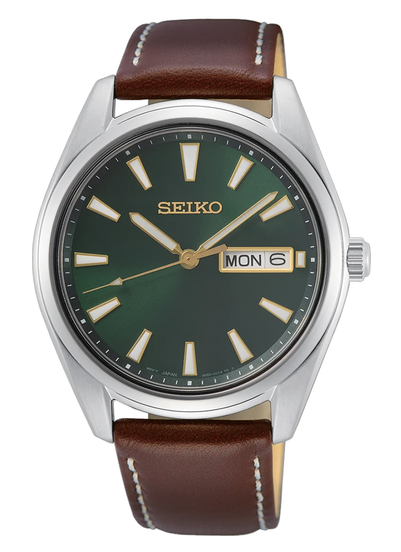 Seiko Classic SUR449P1 jsou hodinky, které spojují elegantní paletu barev s funkčností vytvářející pohodlný model pro každodenní nošení. Zelený ciferník s výrazným efektem slunečního brusu ladí se zlatými indexy a ručičkami, jemně podtrhujícími klasický charakter tohoto časoměřiče. Hnědý kožený řemínek dodává celku přirozenou lehkost a uvolněnější výraz.