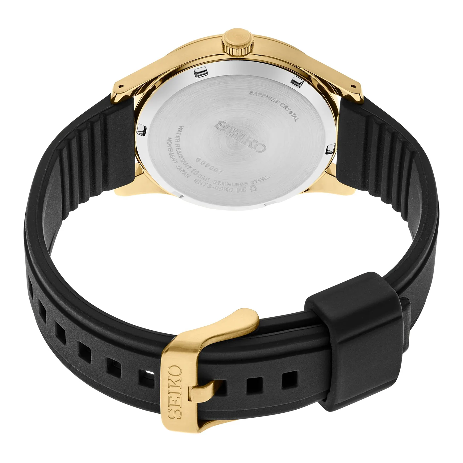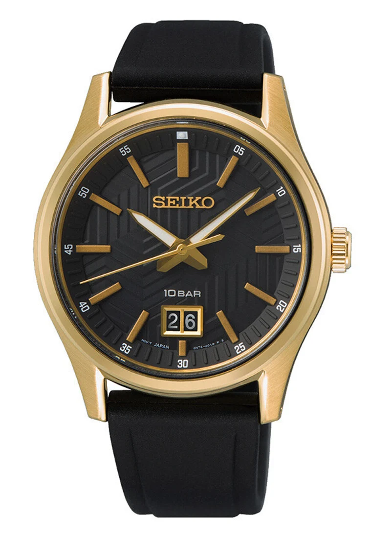 Přední stranu pánských hodinek Seiko kryje safírové sklíčko odolné proti poškrábání. Kryje černý ciferník s pozlacenými elegantními indexy a ručičkami. Výrobce usnadnil čtení času při slabém osvětlení. Ručičky jsou vyplněny světelnou hmotou LumiBrite. Funkčnost tohoto modelu umocňuje zvětšené datumové okénko na šesté hodině. Velké okno zobrazuje aktuální den v měsíci. Design ciferníku umožňuje snadné čtení na první pohled. Prezentovaný model je také vynikající volbou pro fanoušky vodních sportů. Jejich vodotěsnost do 100 metrů umožňuje majiteli plavat s hodinkami na zápěstí bez obav z jejich poškození. Hodinky Seiko na gumovém pásku jsou perfektní hodinky pro každou příležitost.