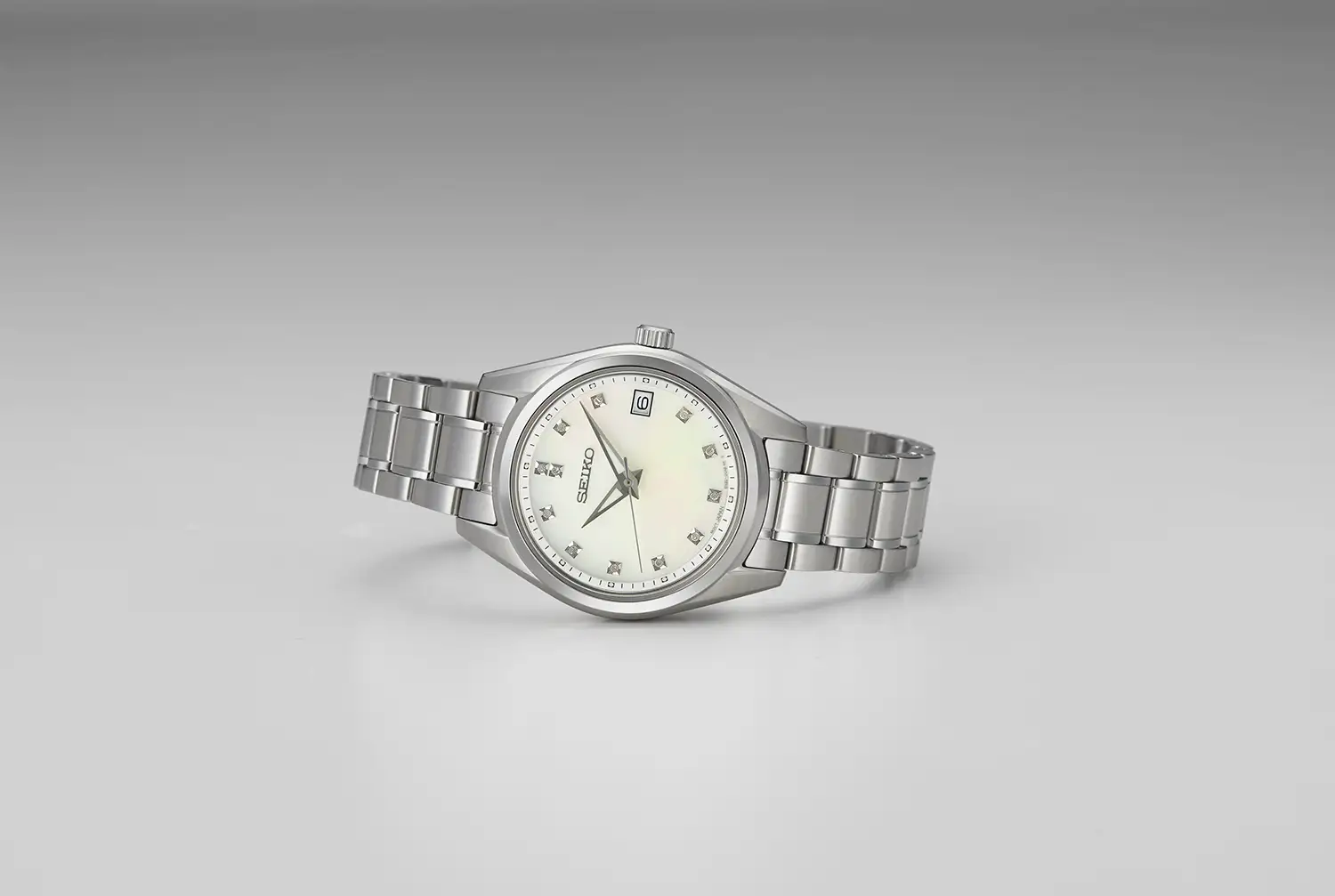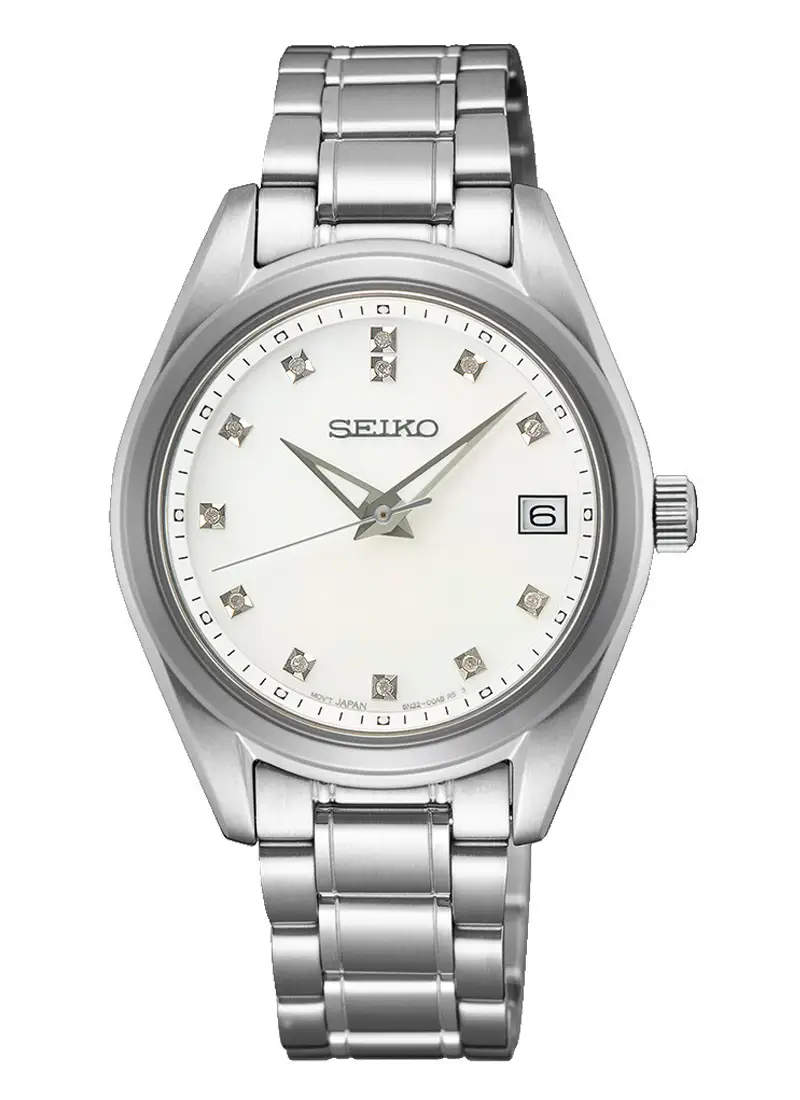 Model se vyznačuje přítomností až 12 přírodních diamantů, osazených jako hodinové indexy, což do návrhu vnáší šperkařskou preciznost a výjimečný charakter. Ocelové pouzdro o průměru 32 mm je odolné proti poškrábání díky safírovému sklíčku a vodotěsnost 100 m zajišťuje bezpečné každodenní používání. Mechanická solidnost značky Seiko je zde spojena s estetikou, která podtrhuje styl každé stylizace – od každodenní až po večerní.