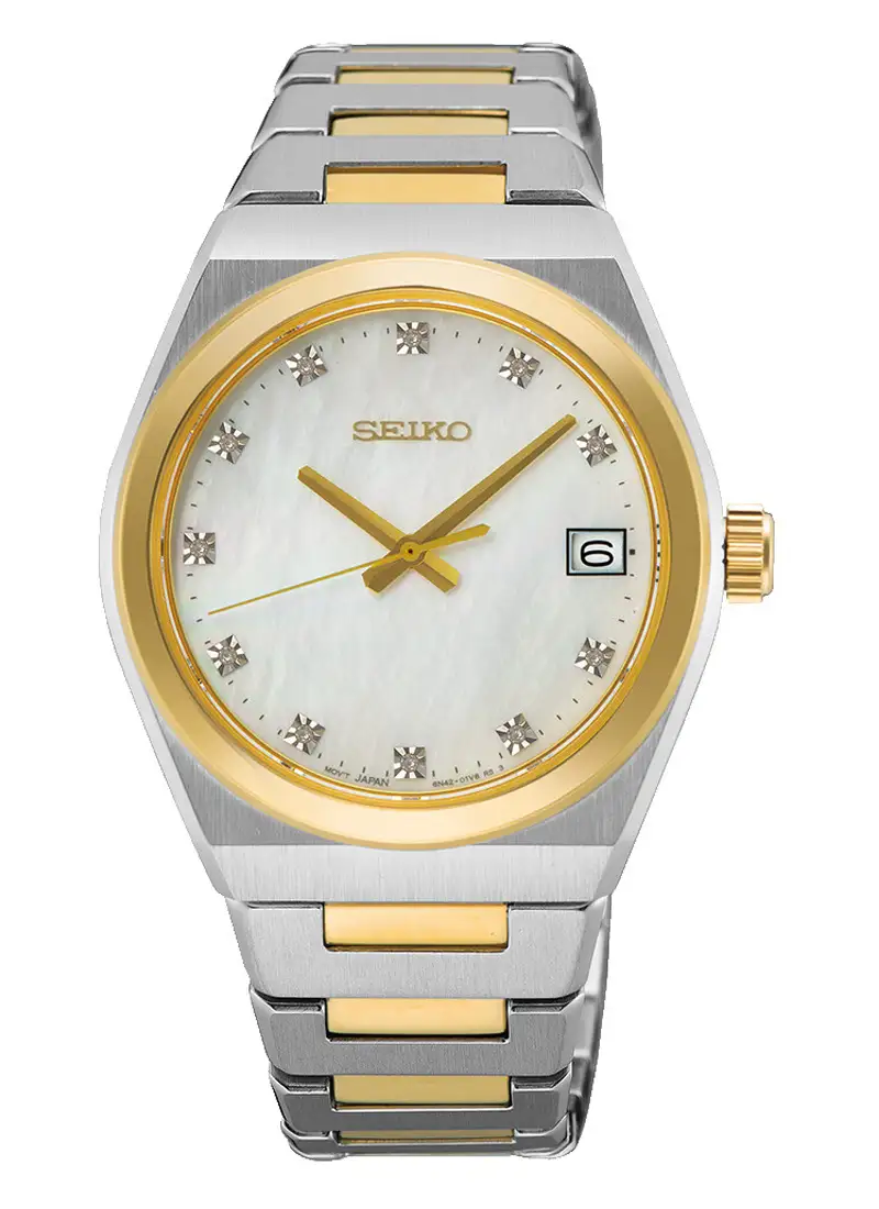 Seiko Classic SUR604P1 je dámské hodinky s elegantním charakterem, u nichž perleť vytváří na celé ploše ciferníku jemný, třpytivý efekt. Světlé odlesky přírodní perleti se krásně doplňují se žlutými akcenty pouzdra a náramku, čímž vytvářejí ucelený, šperkový vzhled ideální pro ženy, které si cení vytříbených doplňků.