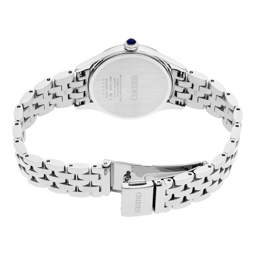 Čelní stranu hodinek chrání odolné safírové sklíčko, které je rezistentní vůči poškrábání, a vodotěsnost 5 bar poskytuje ochranu při kontaktu s vodou. Seiko Classic SUR611P1 je volbou pro ženy, které hledají klasické hodinky s nádechem originality, kde jedinečný odstín zelené podtrhuje osobitý styl nositelky.