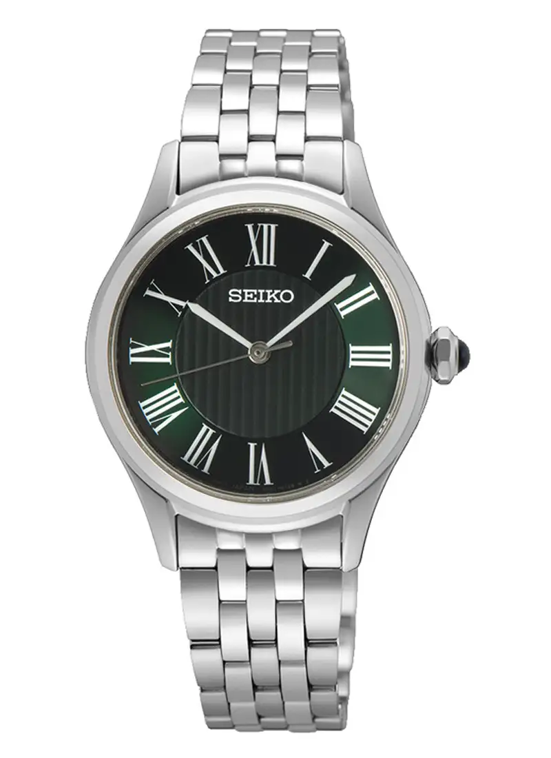 Seiko Classic SUR611P1 je elegantní dámské hodinky s bižuterním charakterem, ve kterých se tradiční forma spojuje s moderní barevností. Zelený ciferník vyniká jemným svislým vzorem v centrální části a klasickými římskými indexy rozmístěnými v ideálních proporcích. Stříbrné ručky vytvářejí harmonický kontrast, zajišťují čitelnost a vytříbený vzhled.