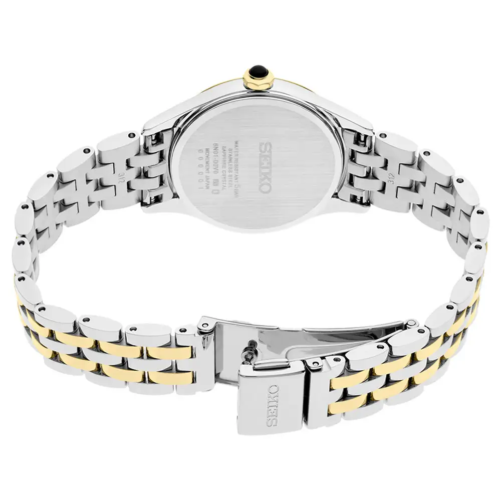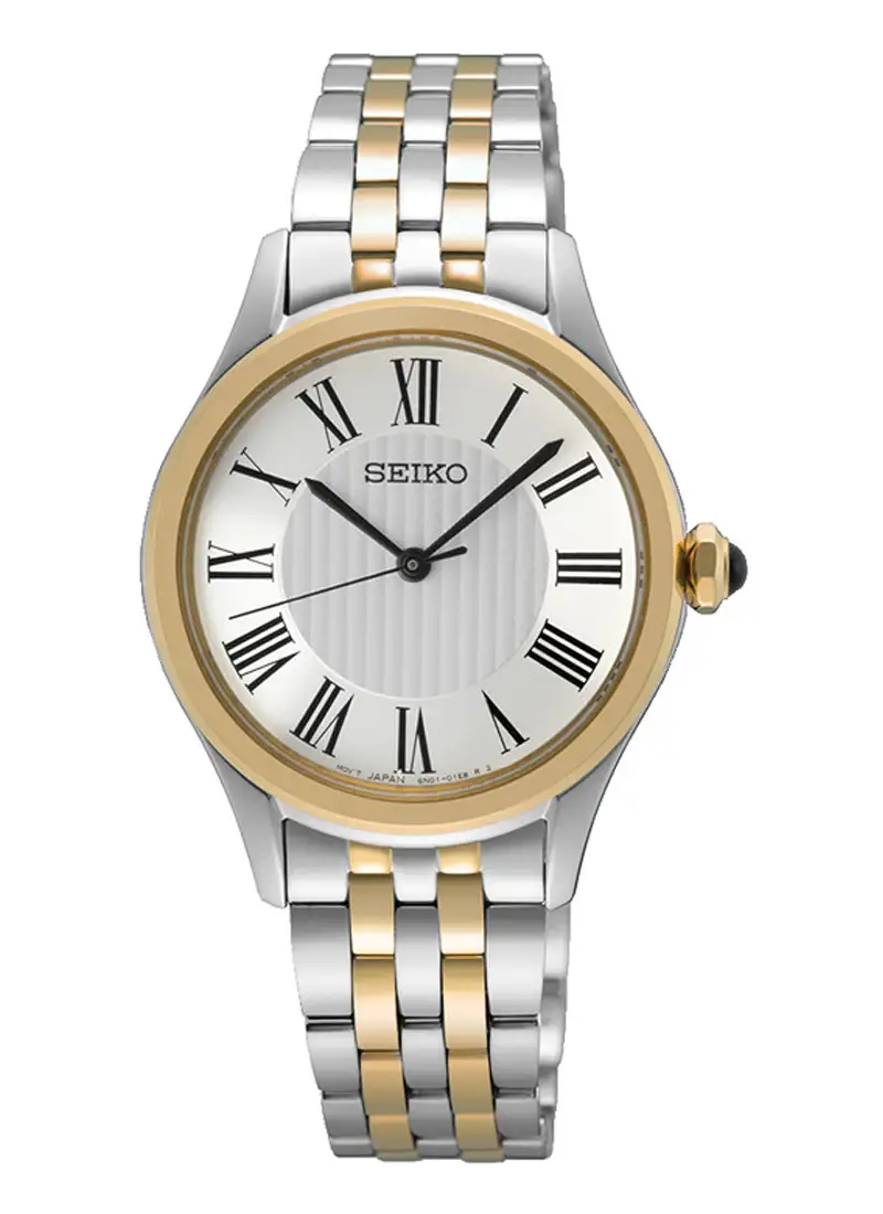 Seiko Classic SUR612P1 jsou elegantní dámské hodinky vytvořené pro ženy, které si cení klasické estetiky v klenotnickém pojetí. Dvoubarevný náramek v odstínech stříbra a zlata jim dodává nadčasový charakter a štíhlé pouzdro harmonicky propojuje jemné linie s elegantními proporcemi.