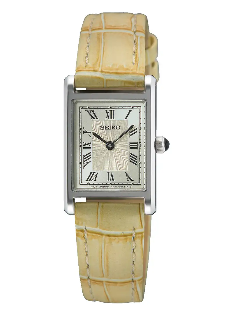 Ciferník se vyznačuje jemným gilošovaným vzorem ve střední části a římskými indexy, které modelu dodávají retro charakter. Štíhlé ručičky zůstávají dobře čitelné a vše chrání odolné sklo Hardlex. Pouzdro s proporcemi 28,0 × 18,9 mm a tloušťkou pouhých 4,9 mm působí na zápěstí lehce a šperkově a podtrhuje ženský styl hodinek.