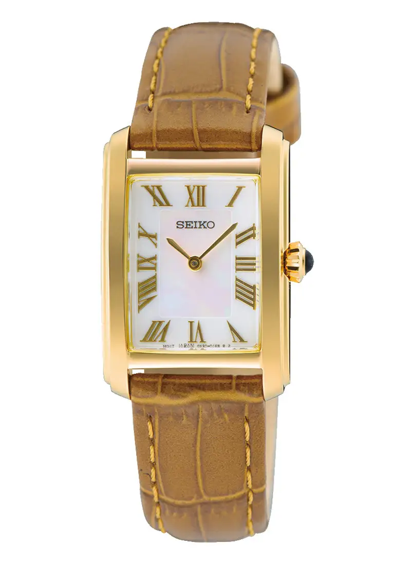 Dámské hodinky Seiko Classic SWR100P1 jsou volbou pro ženy, které si cení klasické elegance v šperkovém podání. Obdélníkové pouzdro ve žlutém zlatě spojuje tradiční designové linie s jemným leskem a vytváří mimořádně stylový doplněk pro každodenní i formální outfity. Štíhlý profil hodinek zdůrazňuje jejich lehkost a detaily typické pro kolekci Classic jim dodávají nadčasový půvab.
