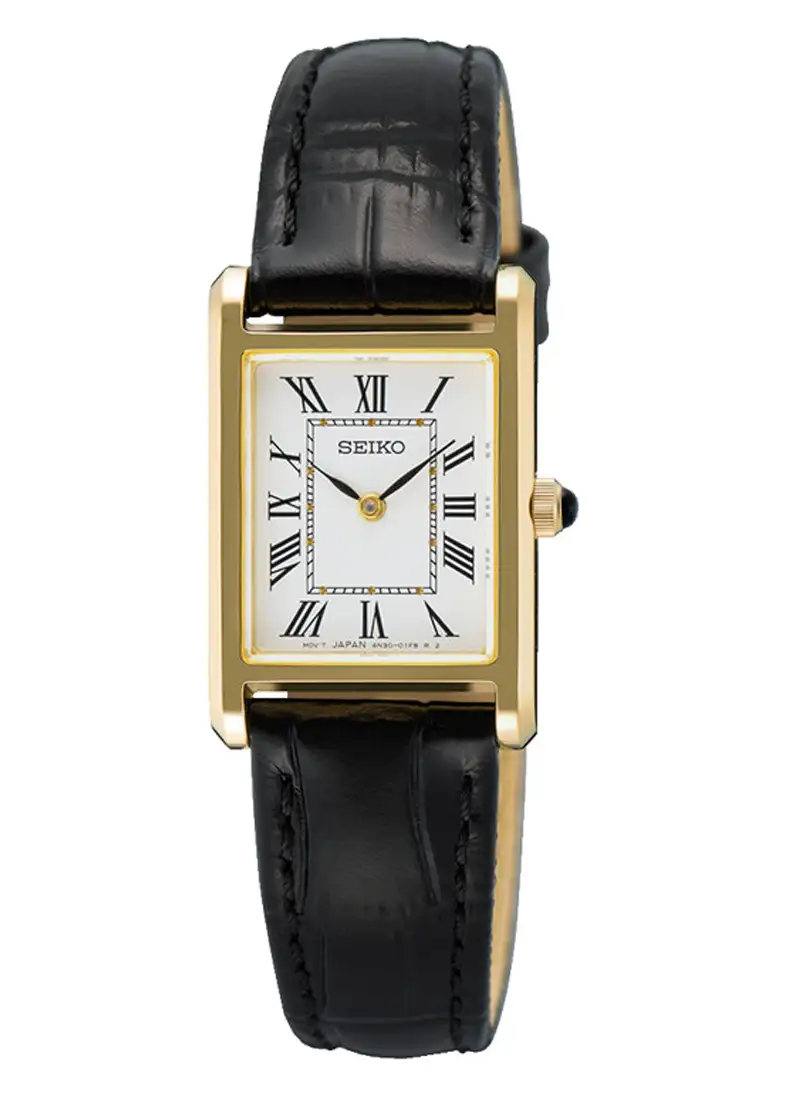 Dámské hodinky Seiko Classic SWR108P1 představují eleganci v její nejčistší podobě, obohacenou o šperkový charakter díky pozlacenému obdélníkovému pouzdru. Jemný bílý ciferník, římské číslice a štíhlé ručky vytvářejí kompozici, která spojuje minimalismus s nadčasovou estetikou klasických dámských hodinek.