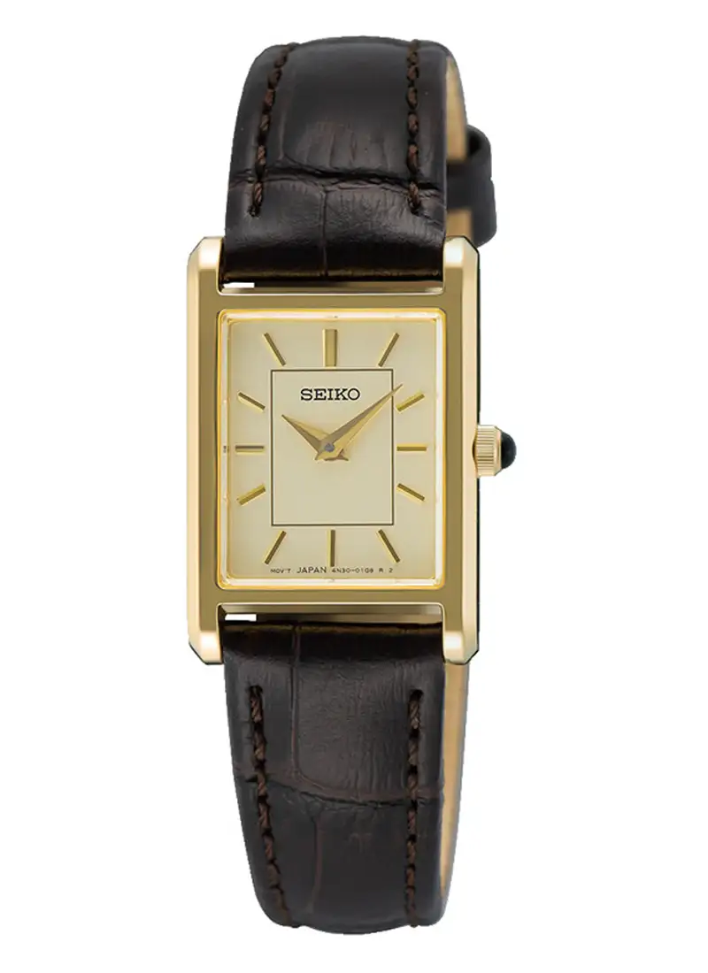 Zegarek damski Seiko Classic SWR110P1 to elegancka propozycja o wyrafinowanej, prostokątnej formie, która łączy biżuteryjny charakter ze schludną, minimalistyczną estetyką. Jasnozłota tarcza, smukłe indeksy oraz delikatne wskazówki tworzą harmonijną kompozycję o wyjątkowo współczesnym charakterze, zachowując jednocześnie odniesienia do klasycznych czasomierzy Seiko.