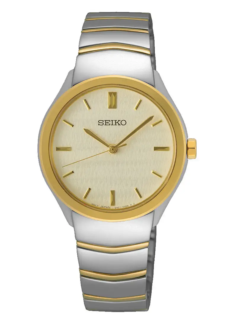 Seiko Conceptual SUR550P1 je dámské hodinky vytvořené pro milovnice elegance v moderním, šperkovém pojetí. Jejich minimalistický, zlacený ciferník s kartáčovaným povrchem jemně odráží světlo a vytváří klidný, harmonický efekt. Model se vyznačuje také dvoubarevným náramkem s charakteristickým uspořádáním článků, kde se matné plochy střídají s leštěnými akcenty a dodávají celku výraznost.