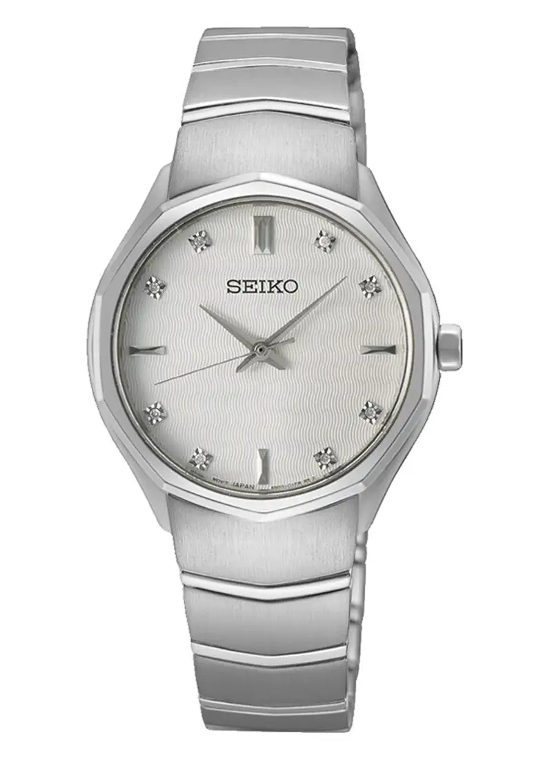 Elegantní dámské hodinky Seiko Conceptual SUR615P1 vynikají moderním charakterem, v němž se geometrické linie pouzdra setkávají s jemným šperkařským výrazem ciferníku. Stříbřitý povrch zdobený vlnitým, drobným gilošováním vytváří subtilní efekt hloubky a osm diamantů rozmístěných po jeho obvodu dodává celku zářivý lesk. Tento model spojuje čistotu tvaru s vytříbeností, dokonale vyhovující ženám, které si cení elegance v každodenním stylu.