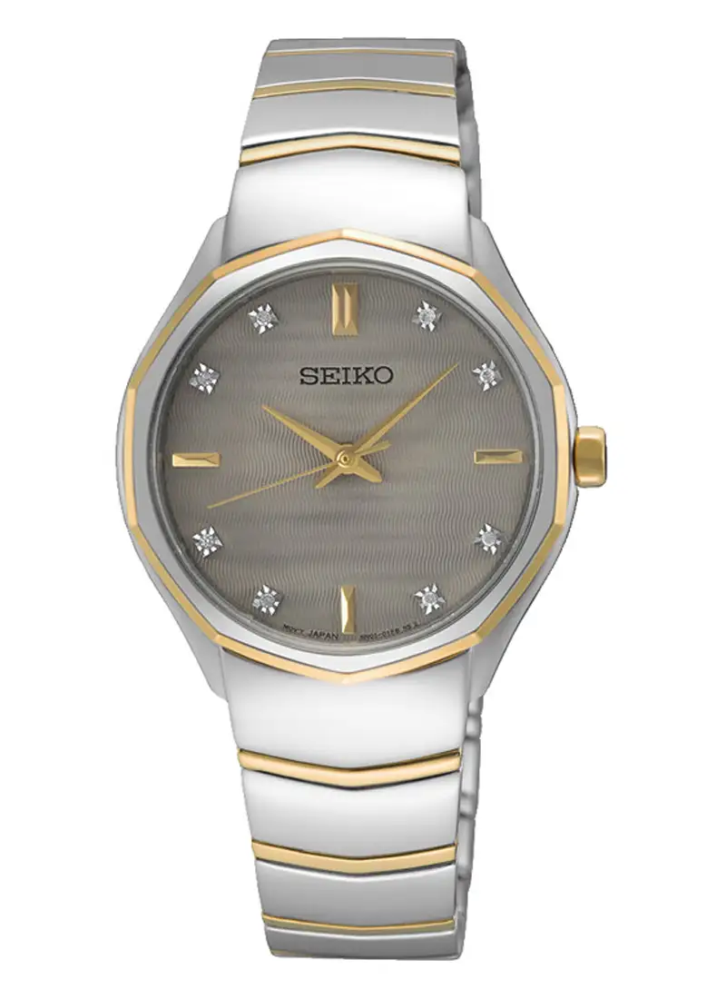 Výjimečné dámské hodinky Seiko Conceptual SUR616P1 okouzlují spojením moderních linií s elegancí v šperkovém pojetí. Ciferník v teplém šedohnědém odstínu je zdoben vlnitým gilošem, který odráží světlo jemným, vícevrstvým způsobem. Osm třpytivých diamantů dodává hodinkám zářivý charakter a pozlacené akcenty na ciferníku decentně podtrhují luxusní tón celé kompozice.