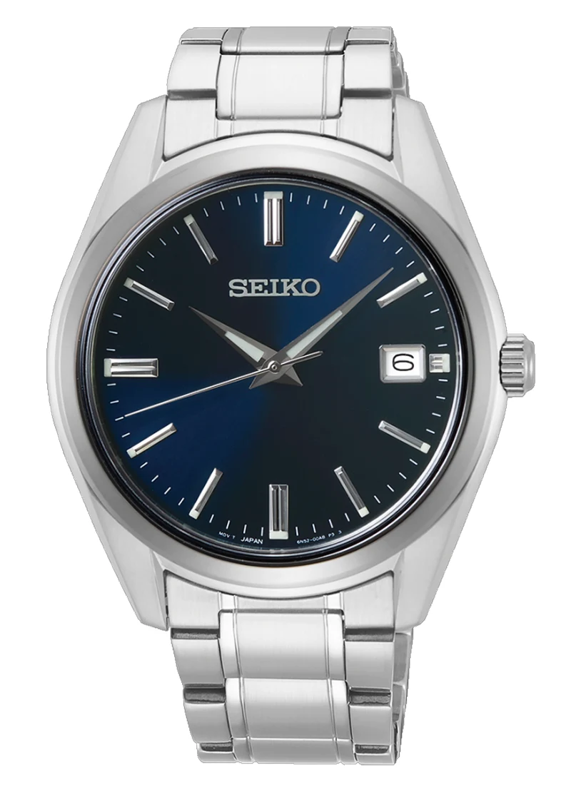 Tmavě modrý, leštěný ciferník má 11 aplikovaných stříbrných hodinových značek. Ty v 6/9/12 hodin jsou dvojnásobné, což umožňuje intuitivně cítit smluvní fáze dne. Na 3. hodině je obdélníkové datumové okénko obklopené ocelovou lunetou. Hodinové indexy jsou doplněny malovanými čarami působícími jako 60minutová stupnice. Celý je pokryt safírovým sklíčkem, které je prakticky odolné proti poškrábání. Tyto pánské hodinky Seiko na stříbrném náramku jsou poháněny japonským kalibrem 6N52.