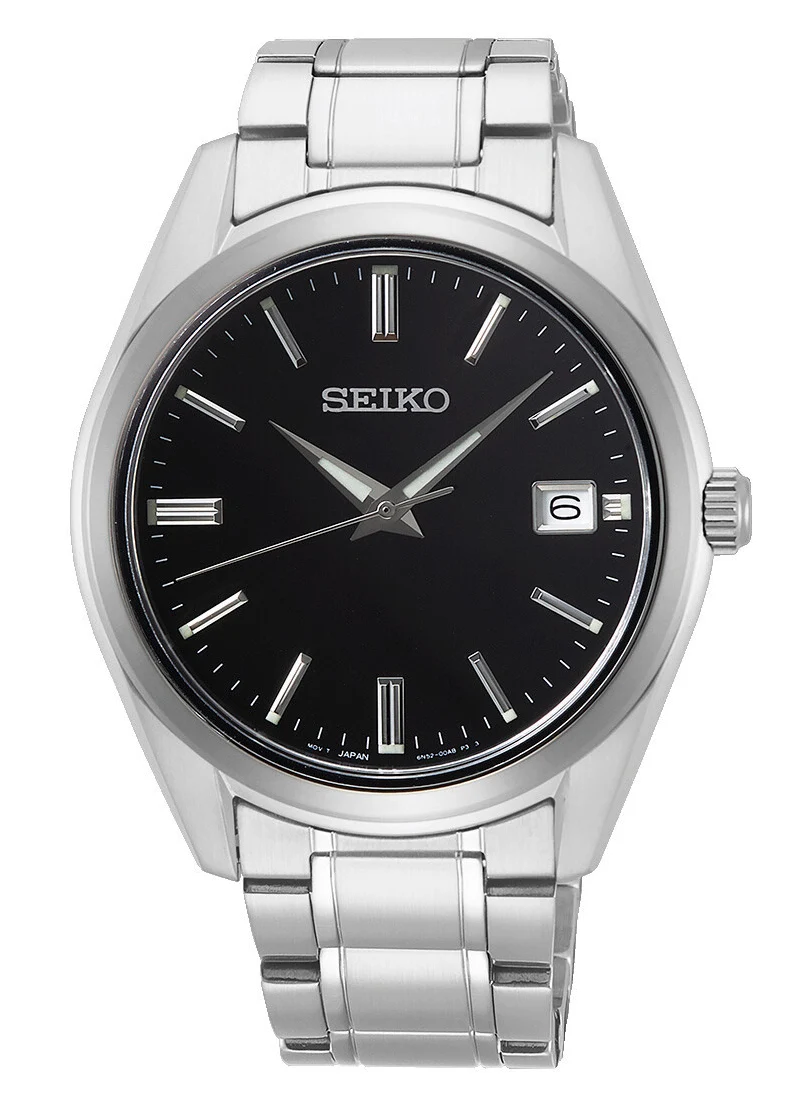 Černý ciferník má 11 aplikovaných stříbrných hodinových značek. Ty v 6/9/12 hodin jsou dvojnásobné, což umožňuje intuitivně cítit smluvní fáze dne. Na 3. hodině je obdélníkové datumové okénko obklopené ocelovou lunetou. Hodinové indexy jsou doplněny malovanými čarami působícími jako 60minutová stupnice. Celý je pokryt safírovým sklíčkem, které je prakticky odolné proti poškrábání. Tyto pánské hodinky Seiko na stříbrném náramku jsou poháněny japonským kalibrem 6N52.